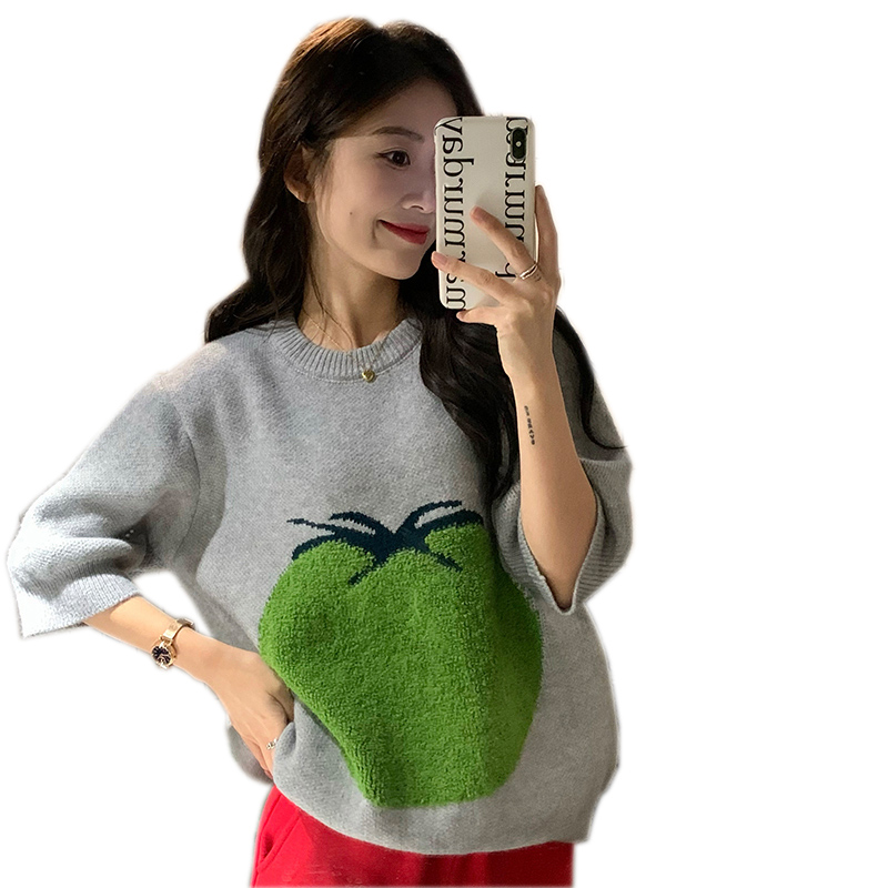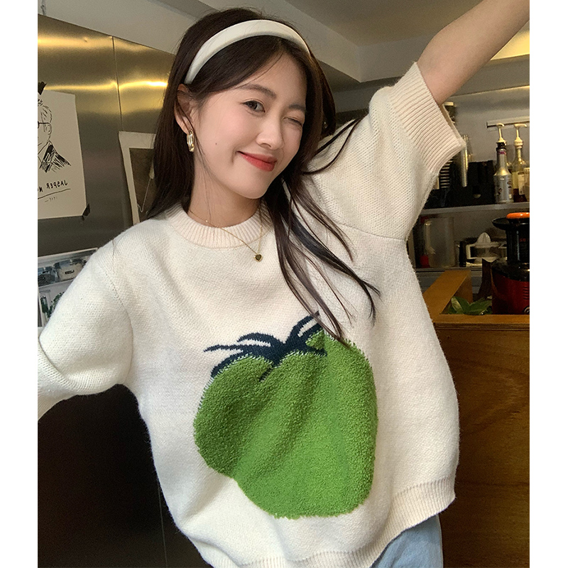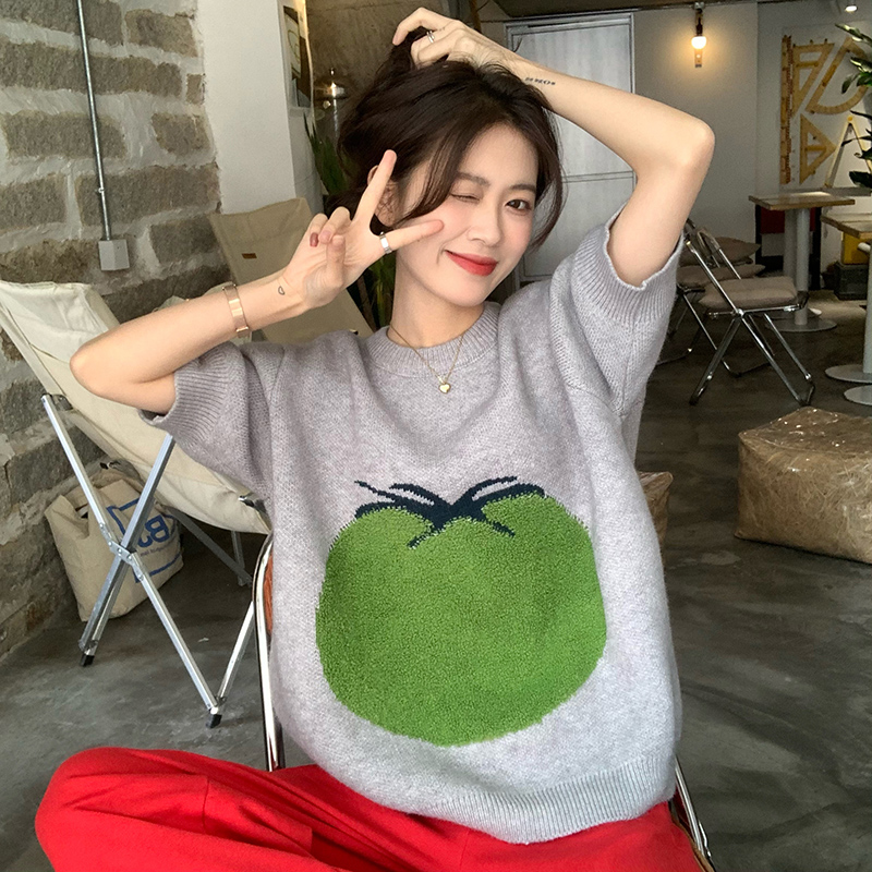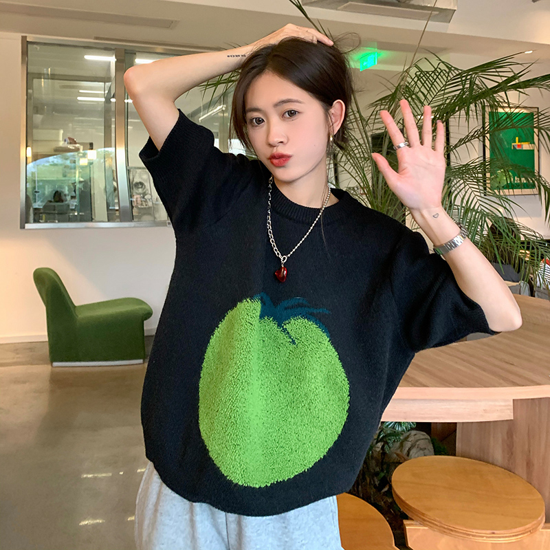 Tomato Fruit Jacquard Round Collar Short Sleeve Sweater Woman Design Sensation Small Crowdsourcing Sloth Wind-Knit Cardigan T-shirt Blouse