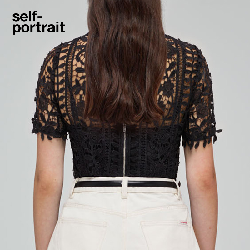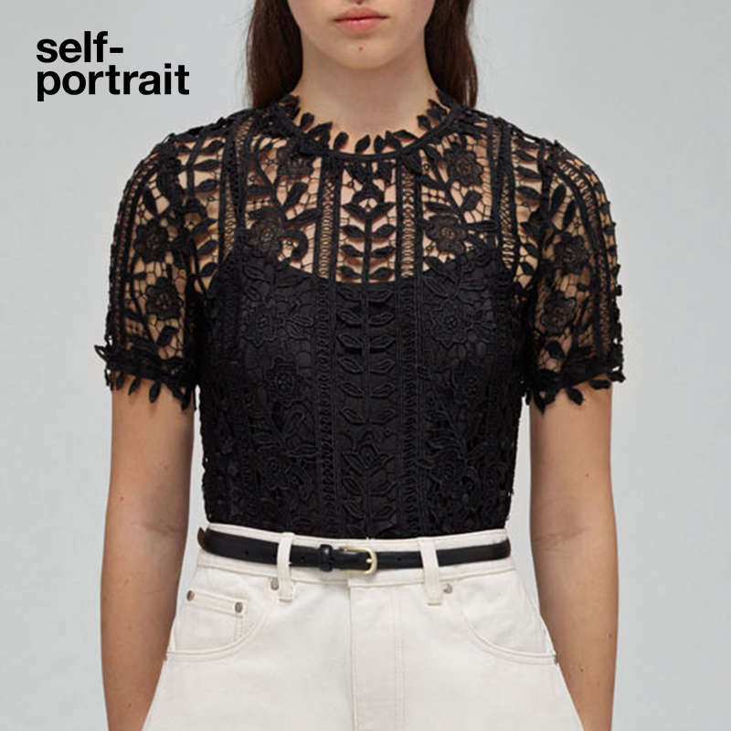 self-portrait 2022 spring and summer classic black high-end lace design all-match short-sleeved top