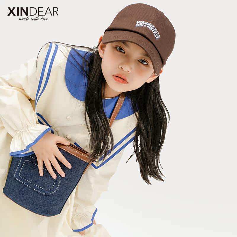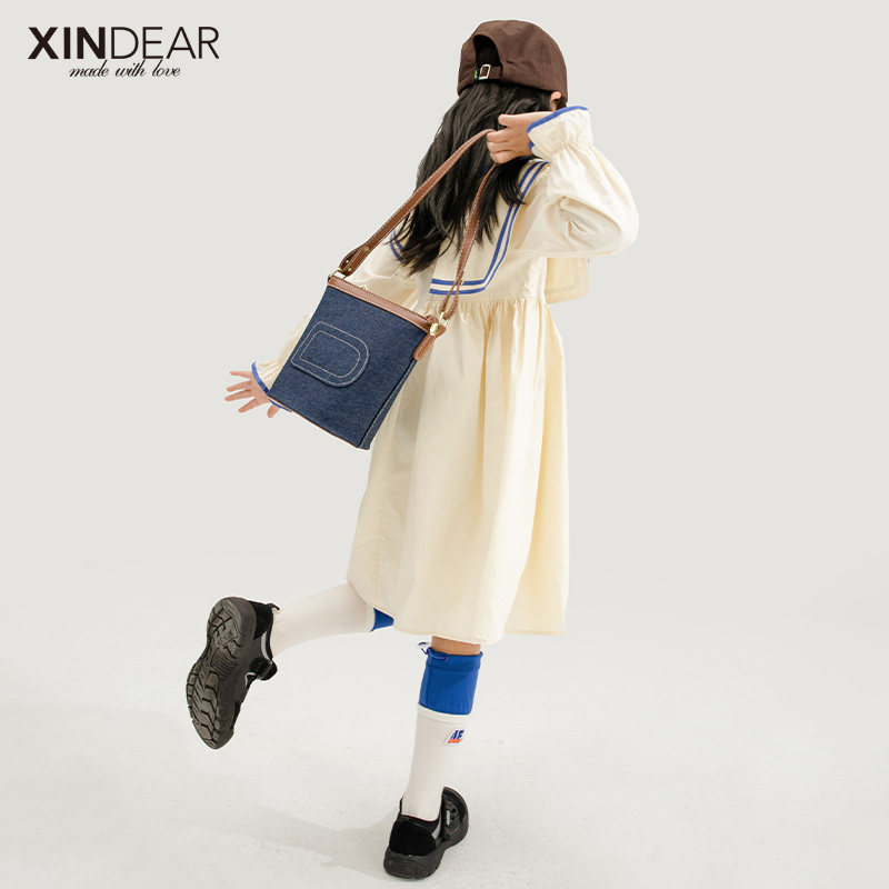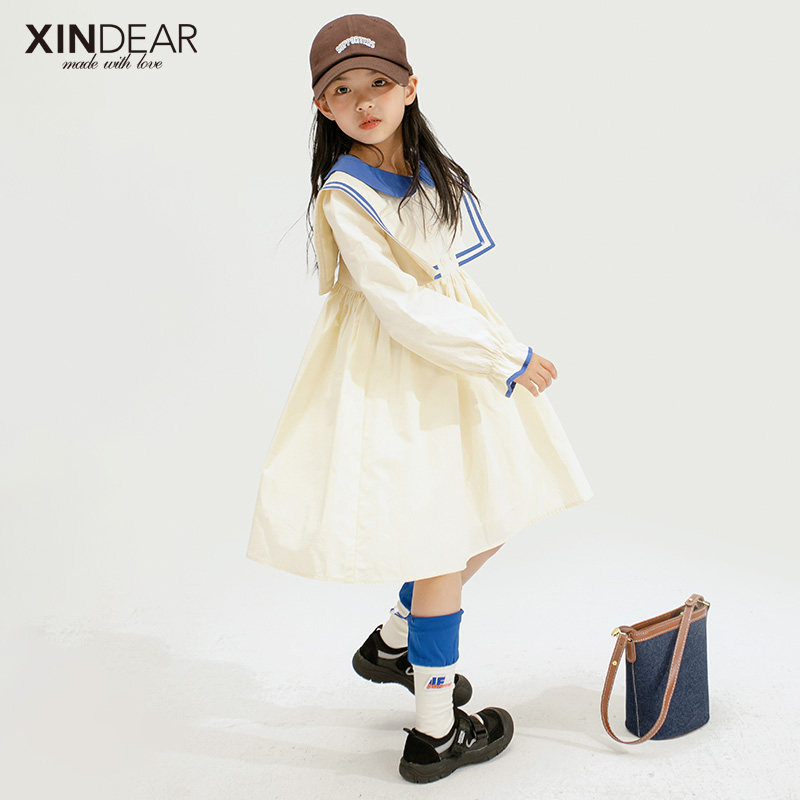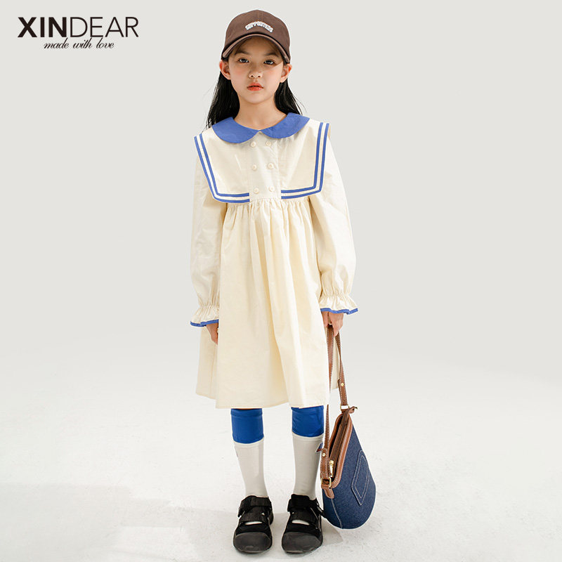 Girl Long Sleeve College Windy Dress 2022 Spring New Girl Navy Collar Full Cotton Spring Autumn Dress Pure Color
