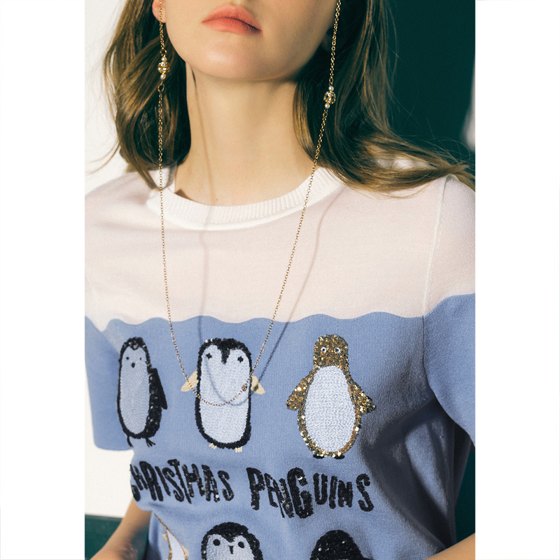 Poetic women's dress 2022 Summer new cartoon nail beads embroidered loose round collar knit short sleeve needle cardiovert