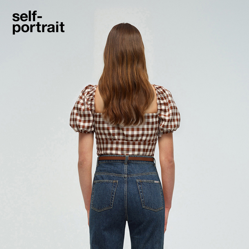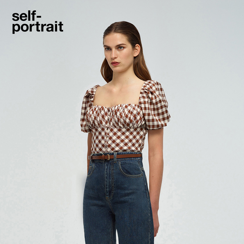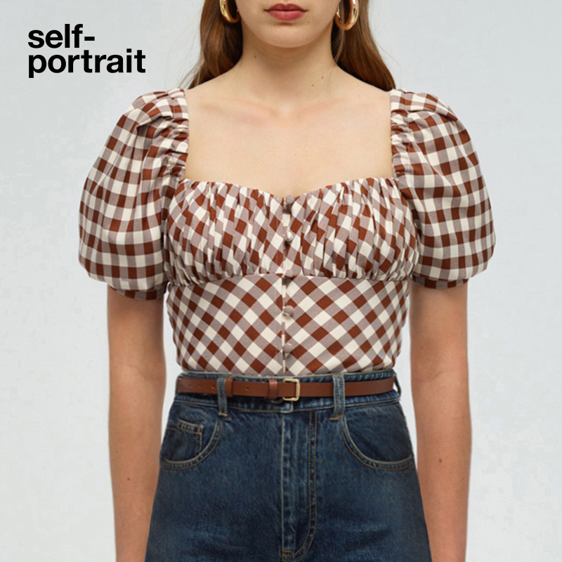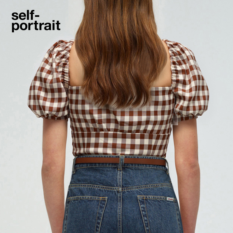Self-portrait 2022 spring and summer camel plaid all-match U-neck puff sleeve design short top