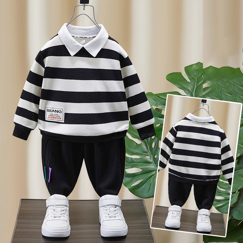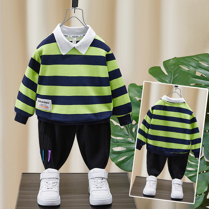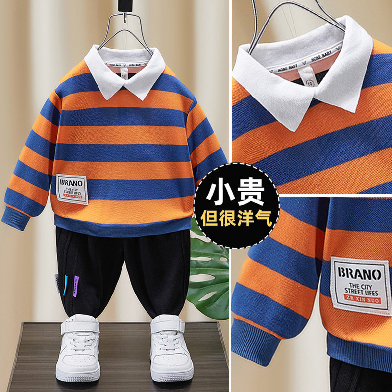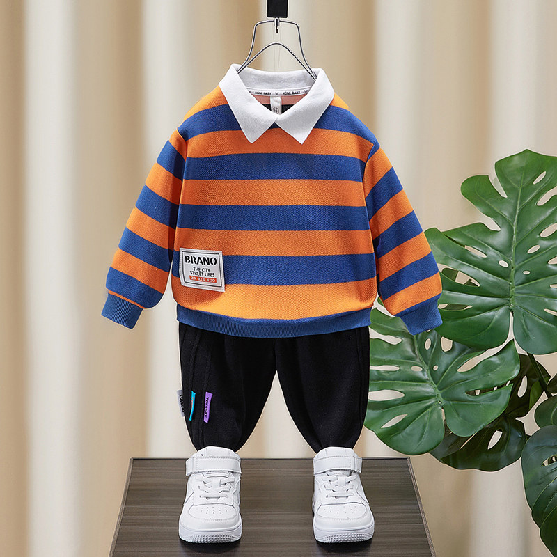 Orange red small flap wide striped sweatshirt green small turquoise collar wide striped sweater black and white small turquoise collar wide striped sweater (suit) orange red small flap wide striped sweatshirt black 3-coloured logo pants (suit)