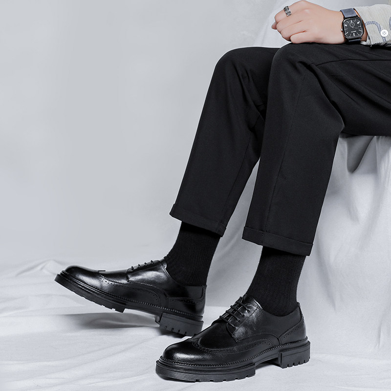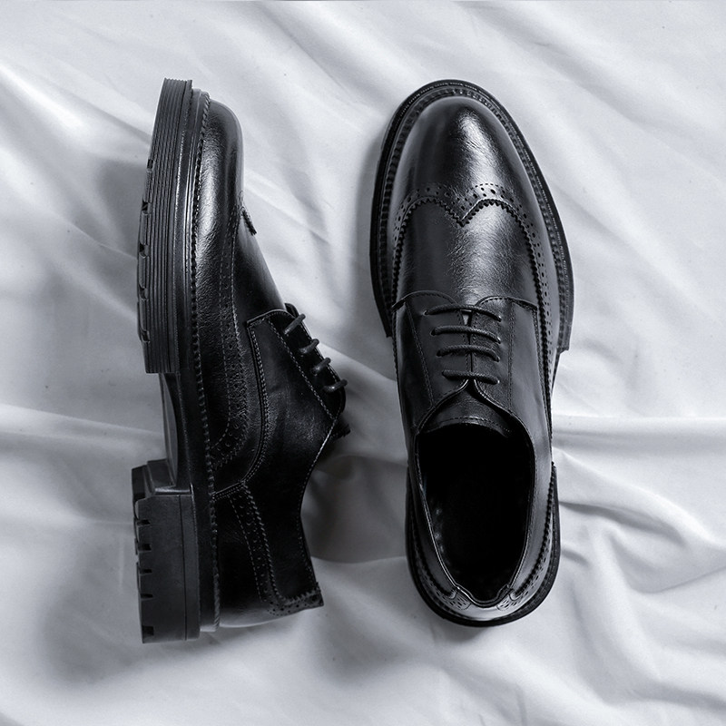 Black youth leather shoes men's Brogue British style suit thick bottom increased business formal wear men's wedding groom shoes