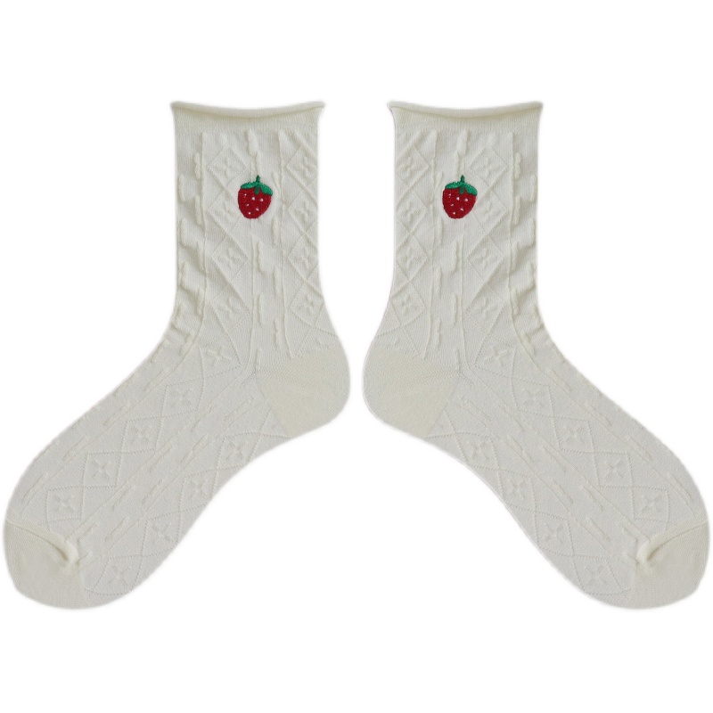 Unknown socks Cream curled socks strawberry cherry small flower embroidered tube socks vertical stripes ins tide