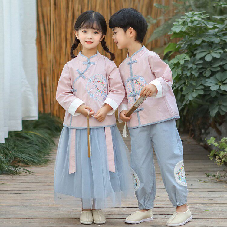 Children's ancient clothes Hanfu Chinese Wind and men's kindergarten performed to serve three characters through disciples of the disciples to perform the spring and summer
