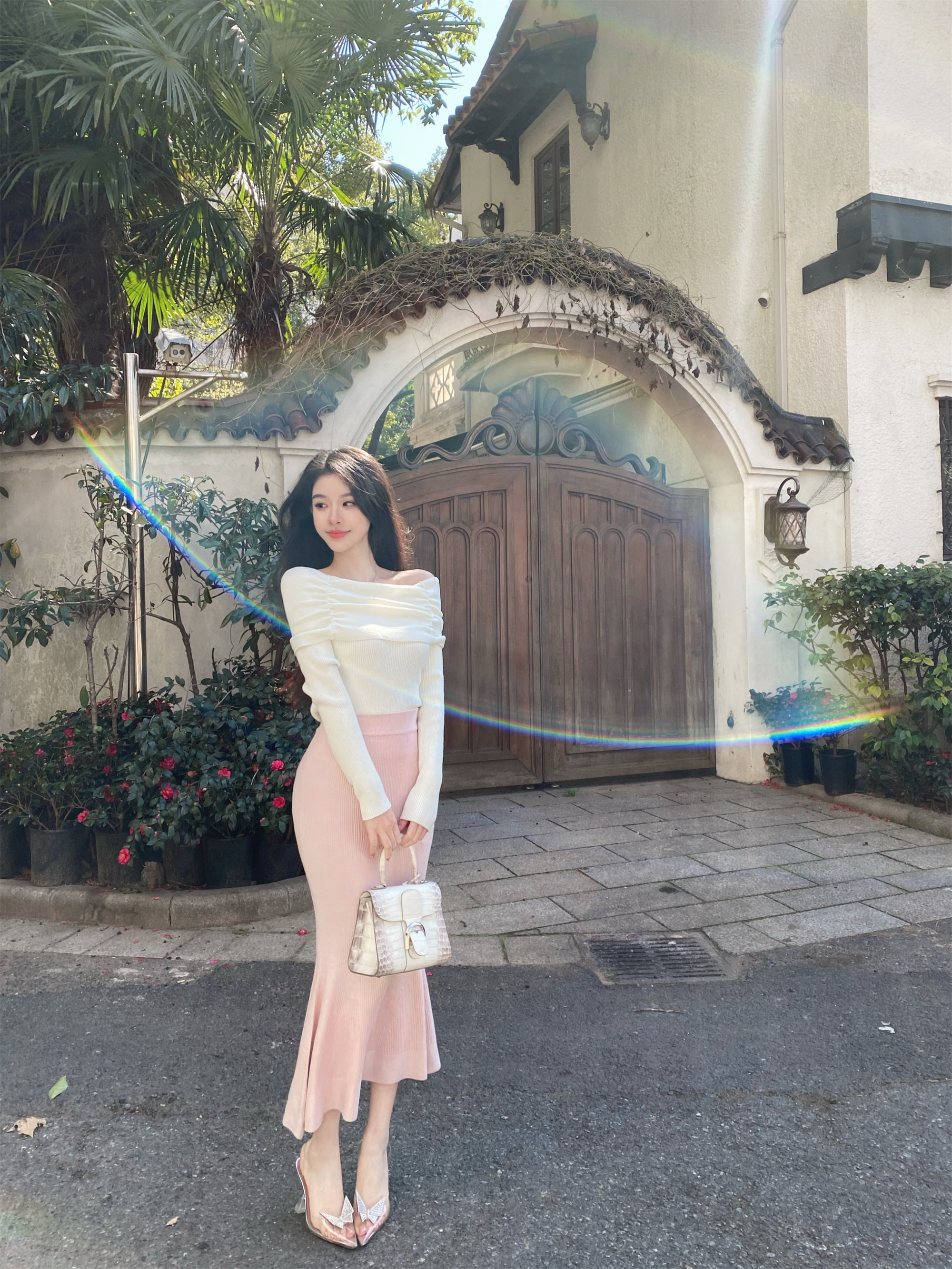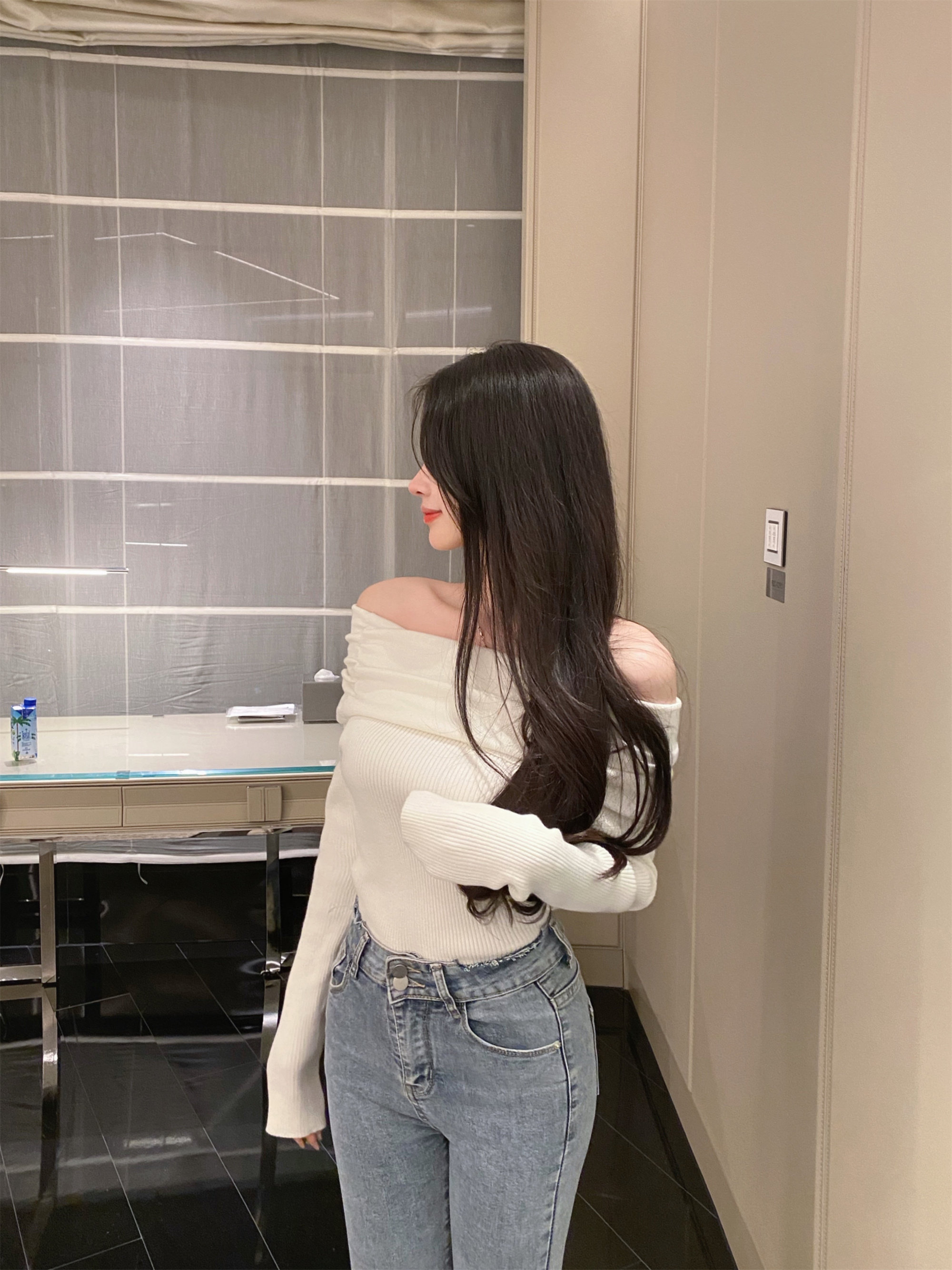 CHU Little first sweet and beautiful dew shoulder lined with knitted blouse pure desire temperament white knit jersey woman