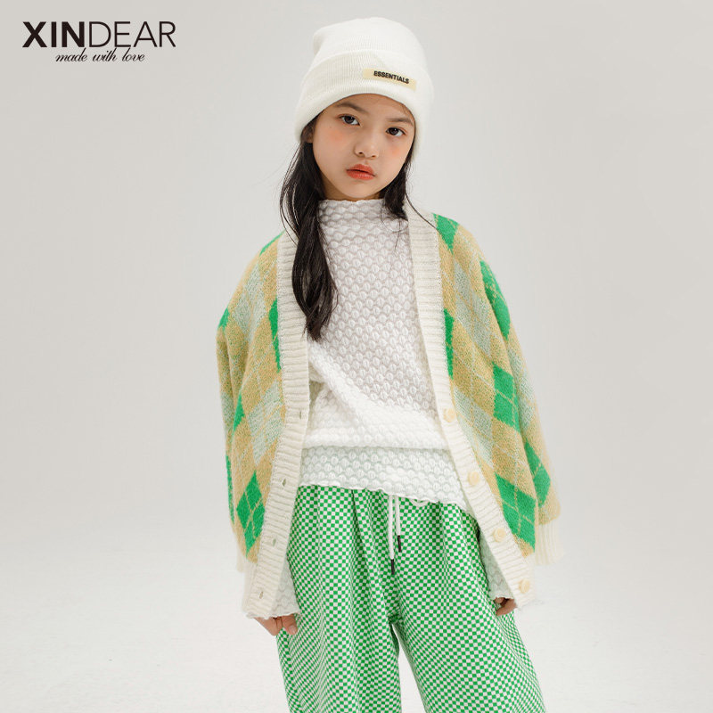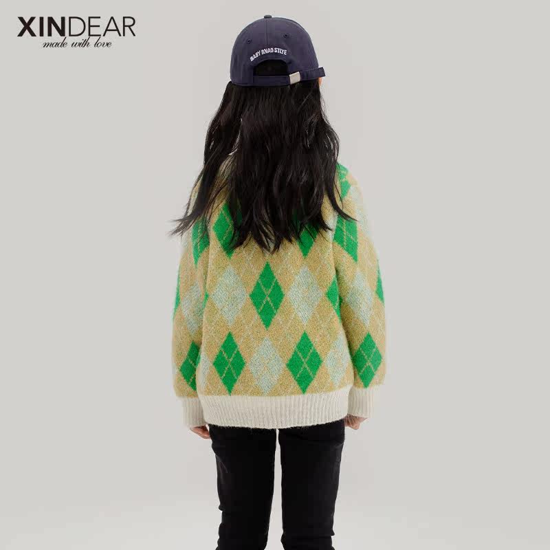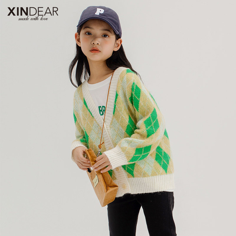 Girl's spring and autumn sweater cardiovert jacket 2022 Spring baby V collar grid knit trendy blouse Korean version 100 hitch