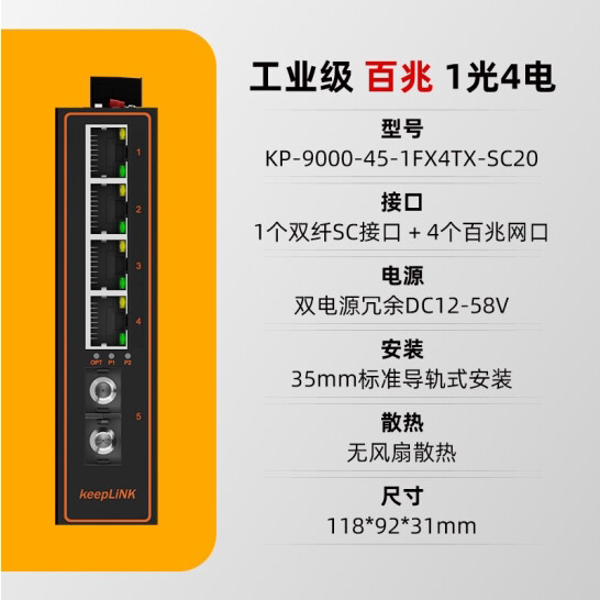 keepLINK KP-9000-45-1FX4TX-SC20 100 Mbps 1 Optical 4 Electrical Industrial Grade Switch Transceiver