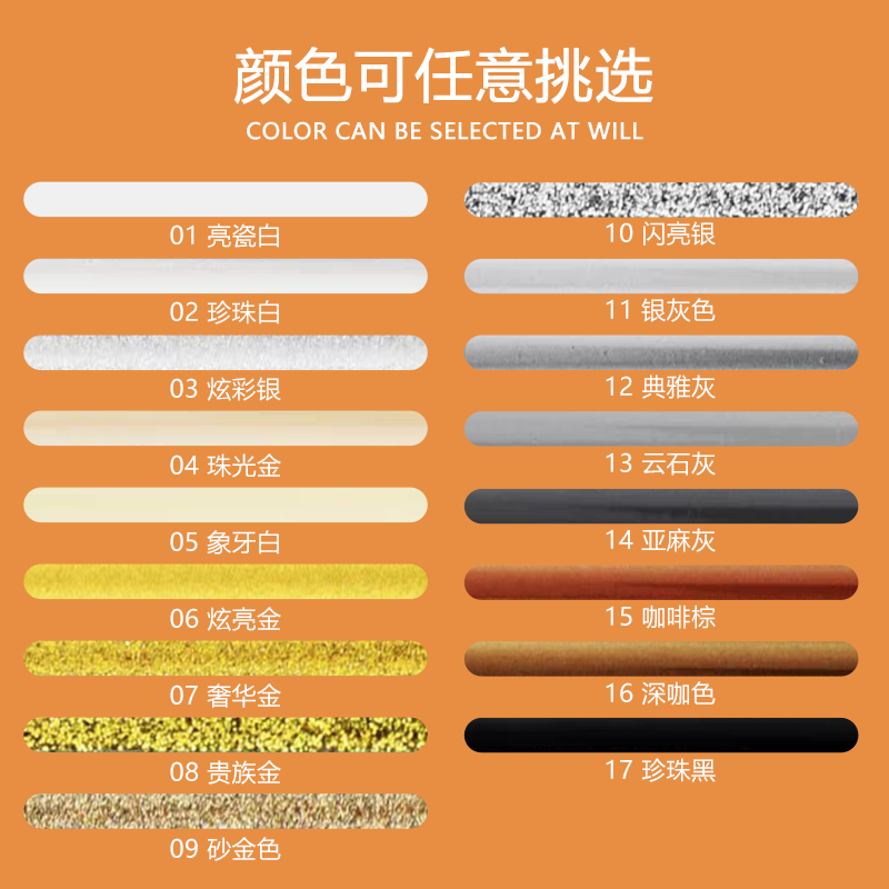 1#亮瓷白3#炫彩银6#炫亮金7#奢华金10#闪亮银11#银灰色12#典雅灰13#云石灰14#亚麻灰(with the exception of 5 groups of up and out replenishment)