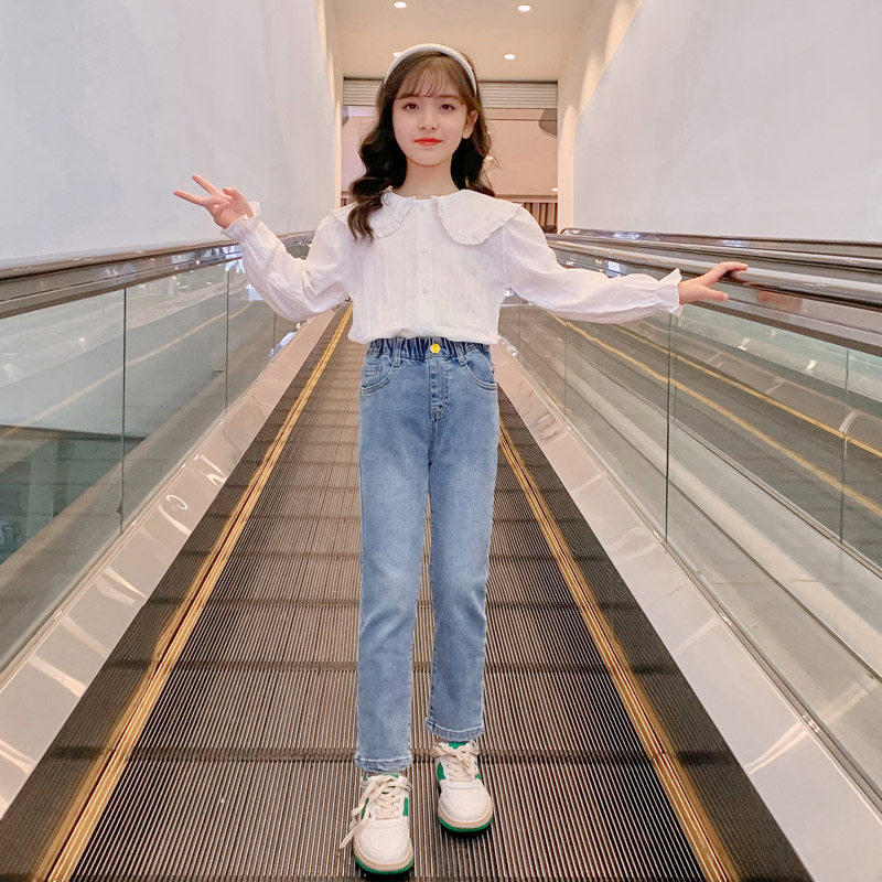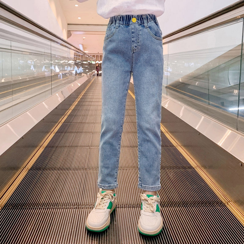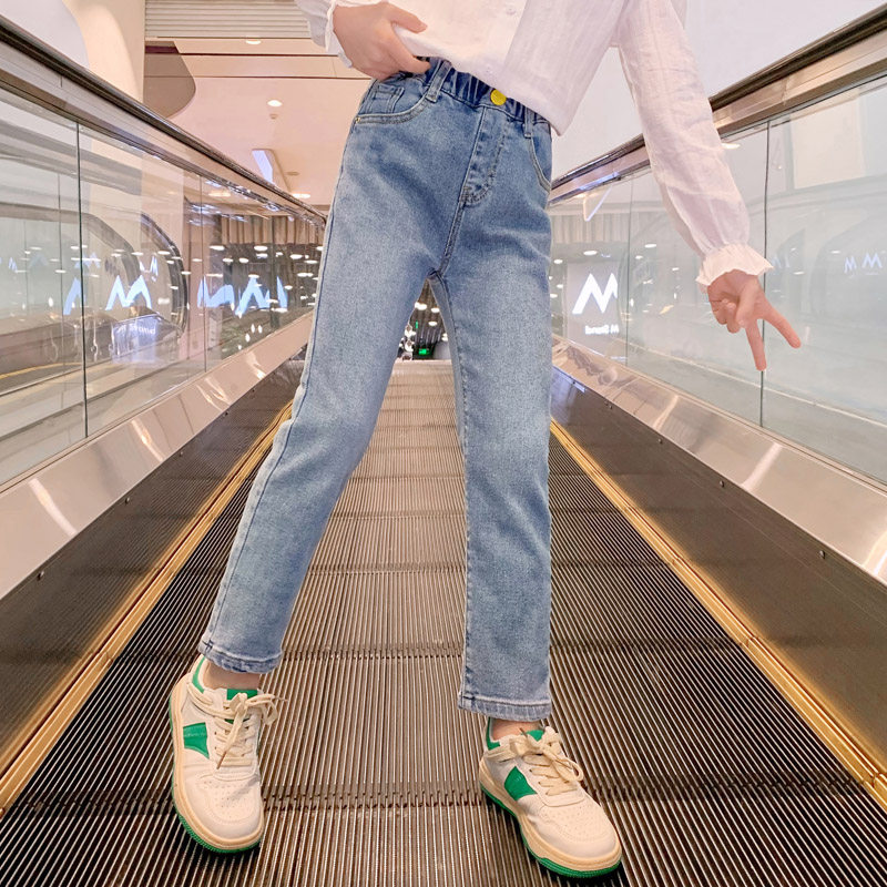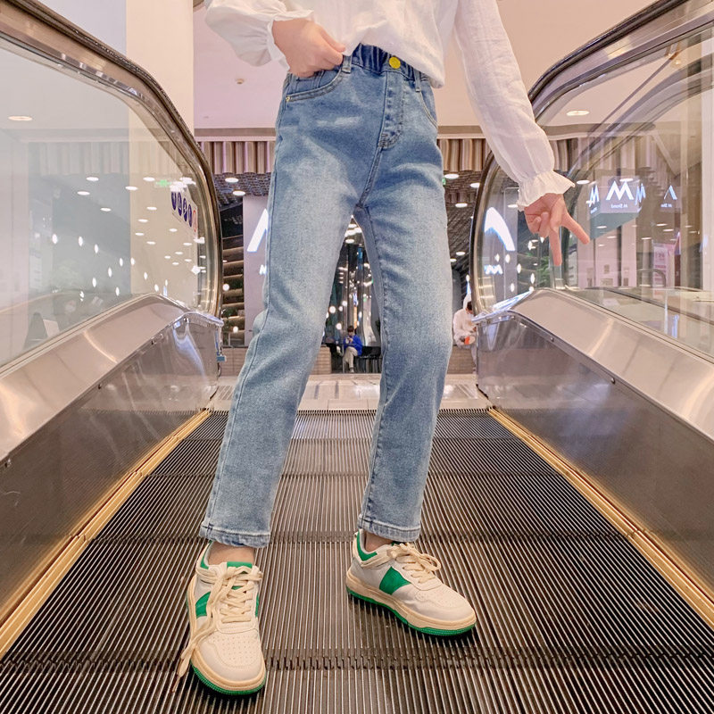 Girl Jeans Spring Autumn 2022 New Spring Dress Foreign Pie Trousers Outside Wearing Children Pants Elastic Body Straight Drum Pants
