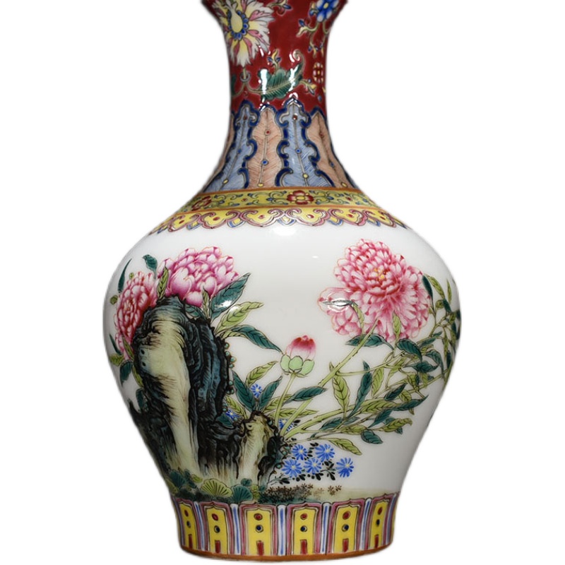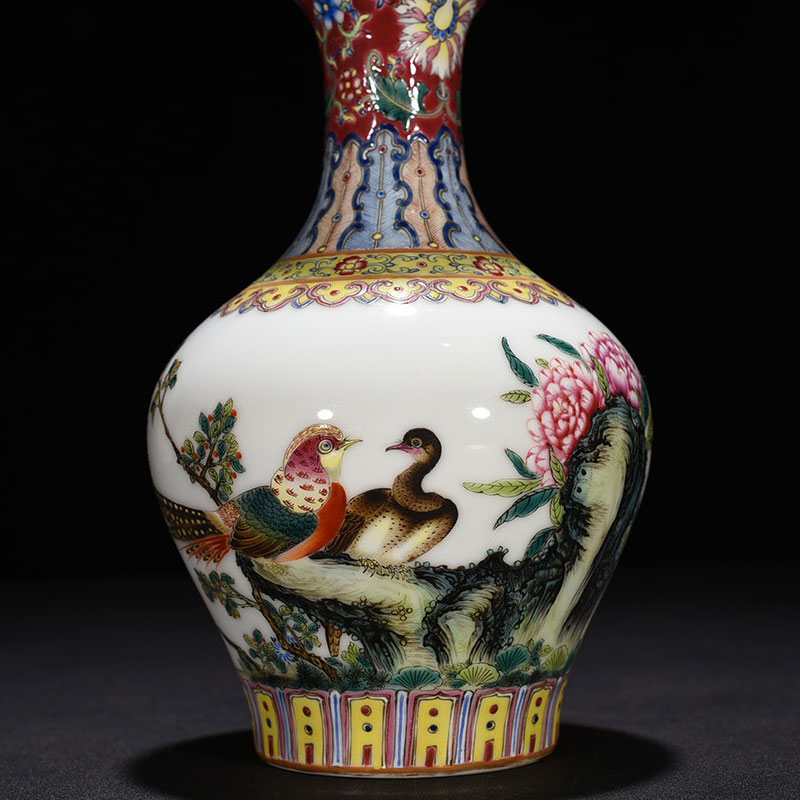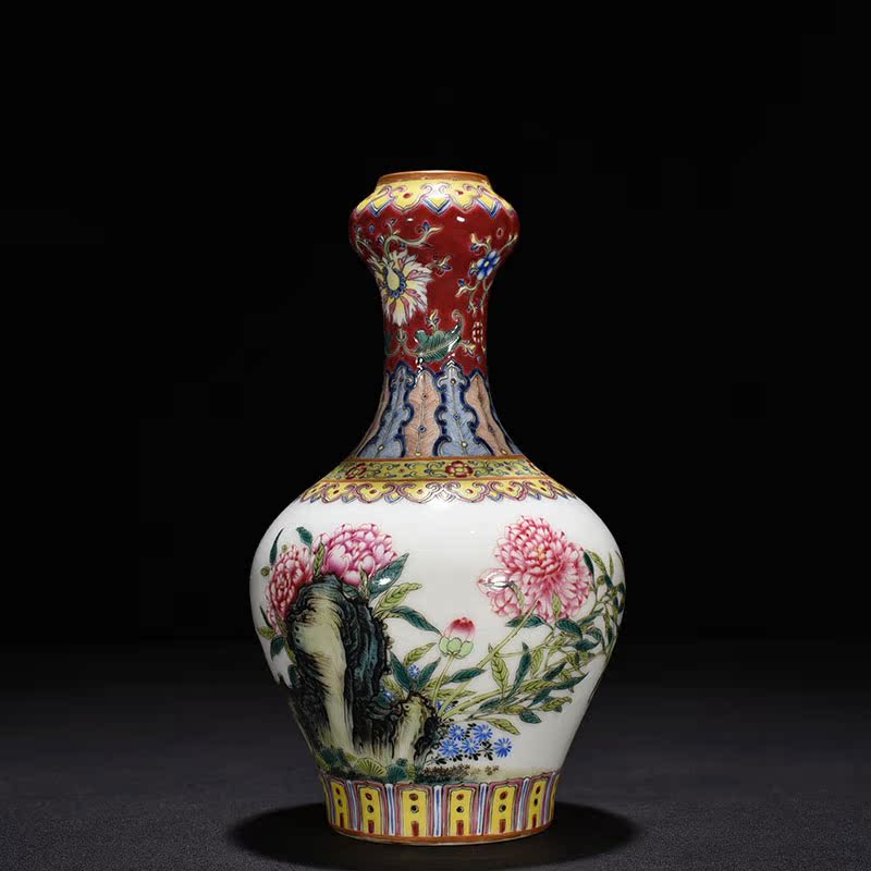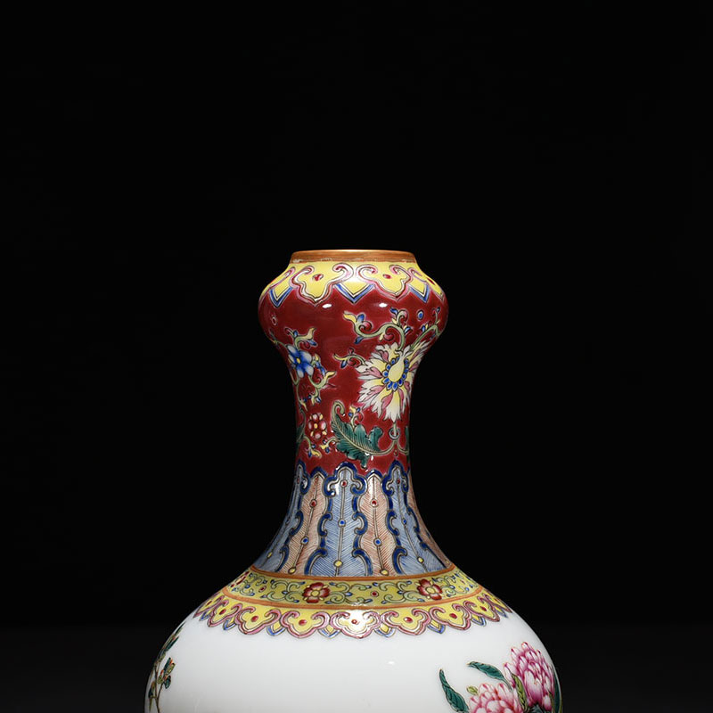 Clear Yongzheng enamel colorful flowers and bird tattooing garlic head bottle