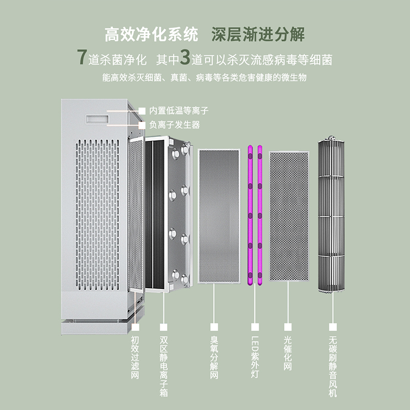 Primary filter screen Dual-zone high voltage electrostatic field Ozone decomposition screen UV ultraviolet lamp Photocatalytic screen