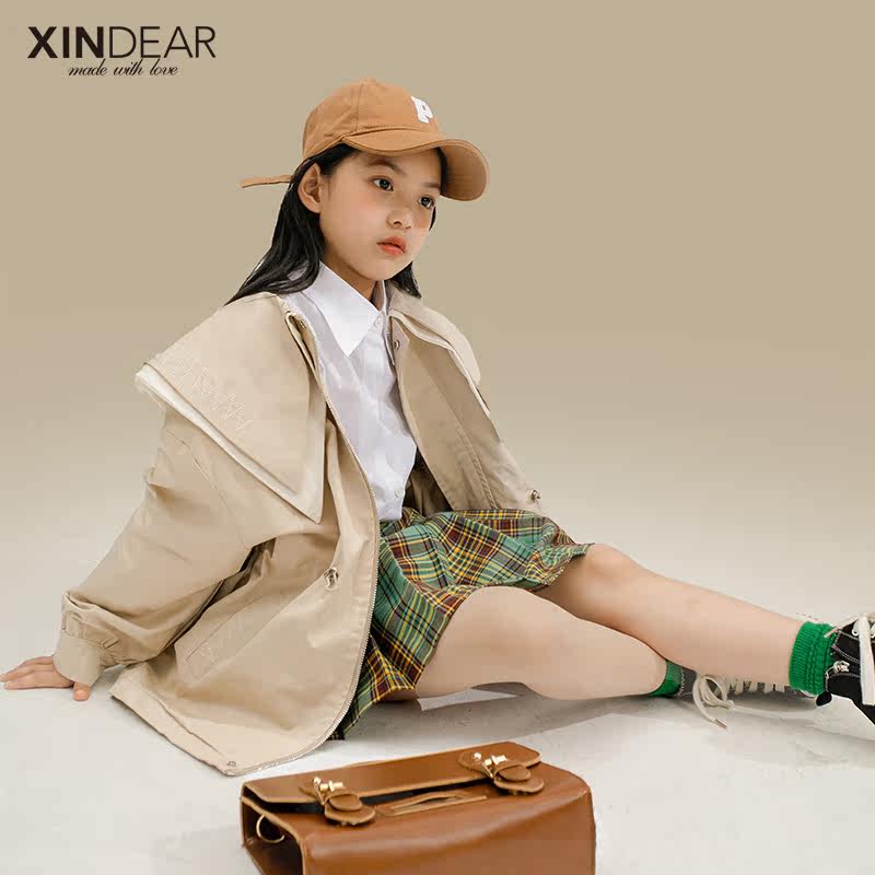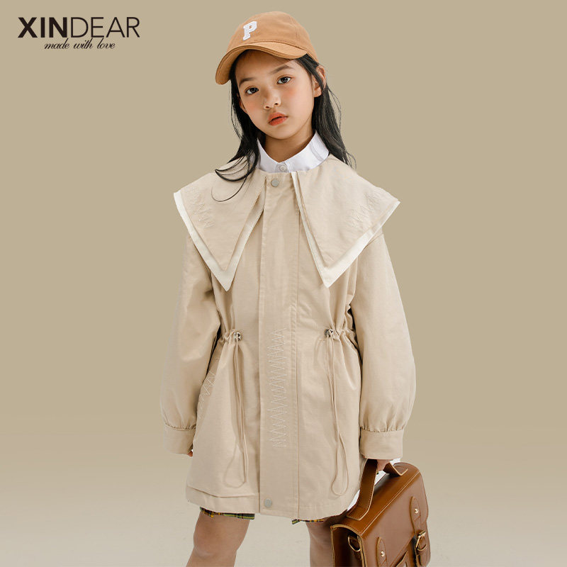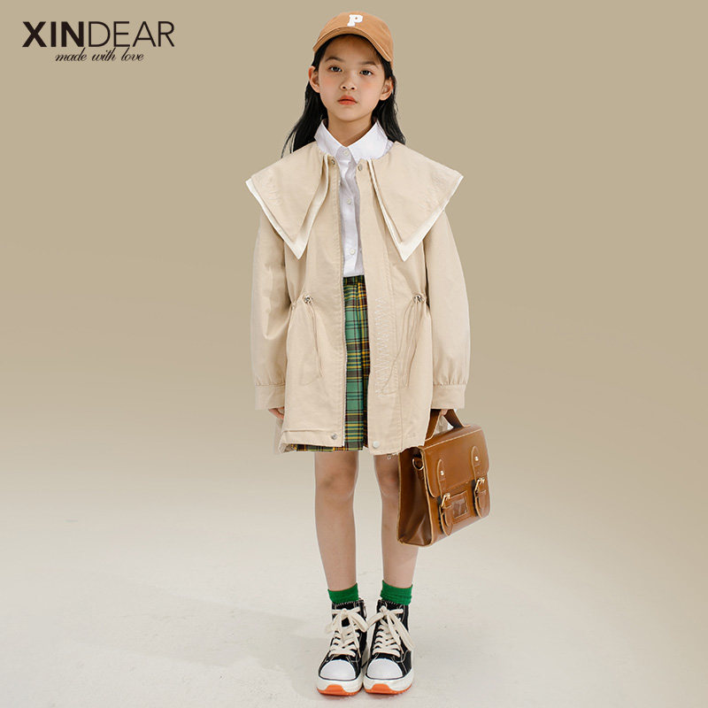 Girl's medium long version of the wind coat jacket 2022 Spring autumn new college collar blouse cotton fabric CUHK Tong pure color Korean version