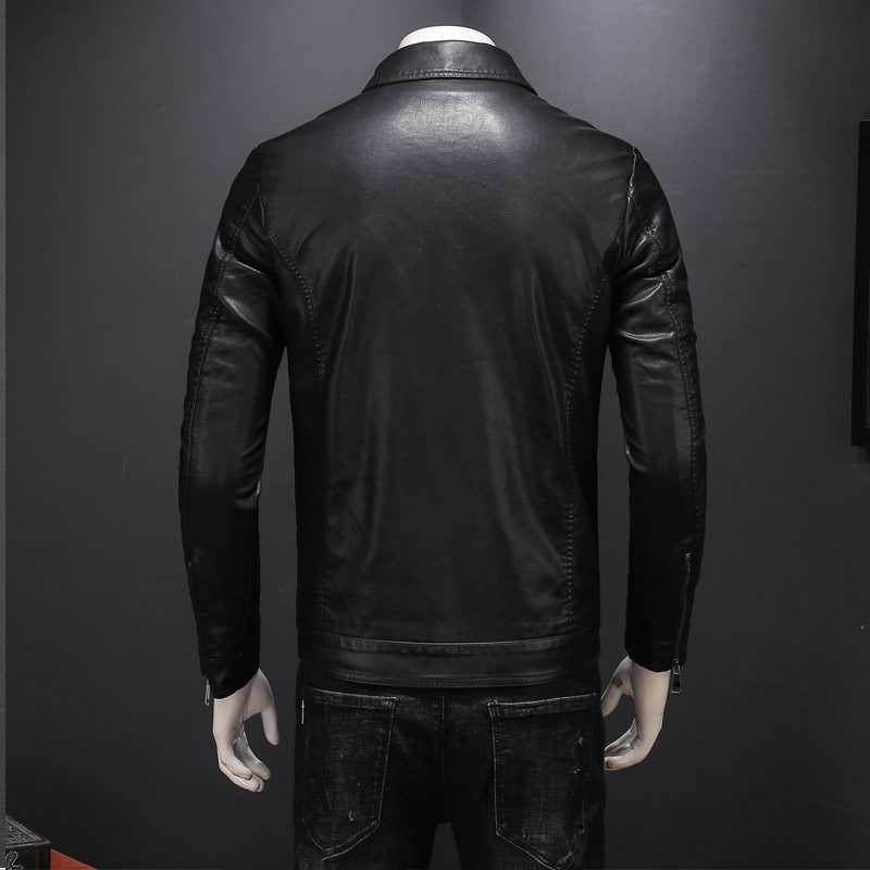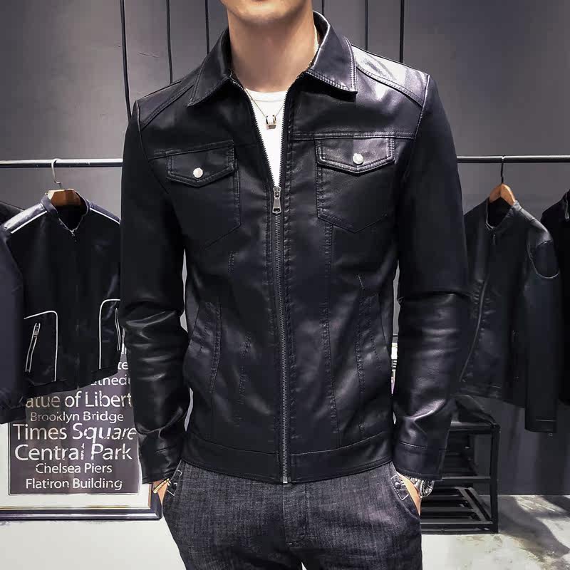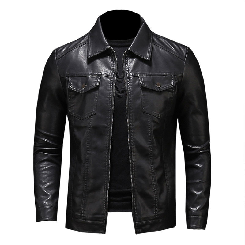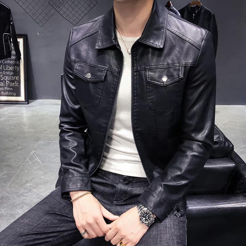 2022 Chunqiu Men's turnover Locomotive Leather Jacket Youth Jacket Multiple Pockets Pure Color Black Imitation Leather Clothes Men