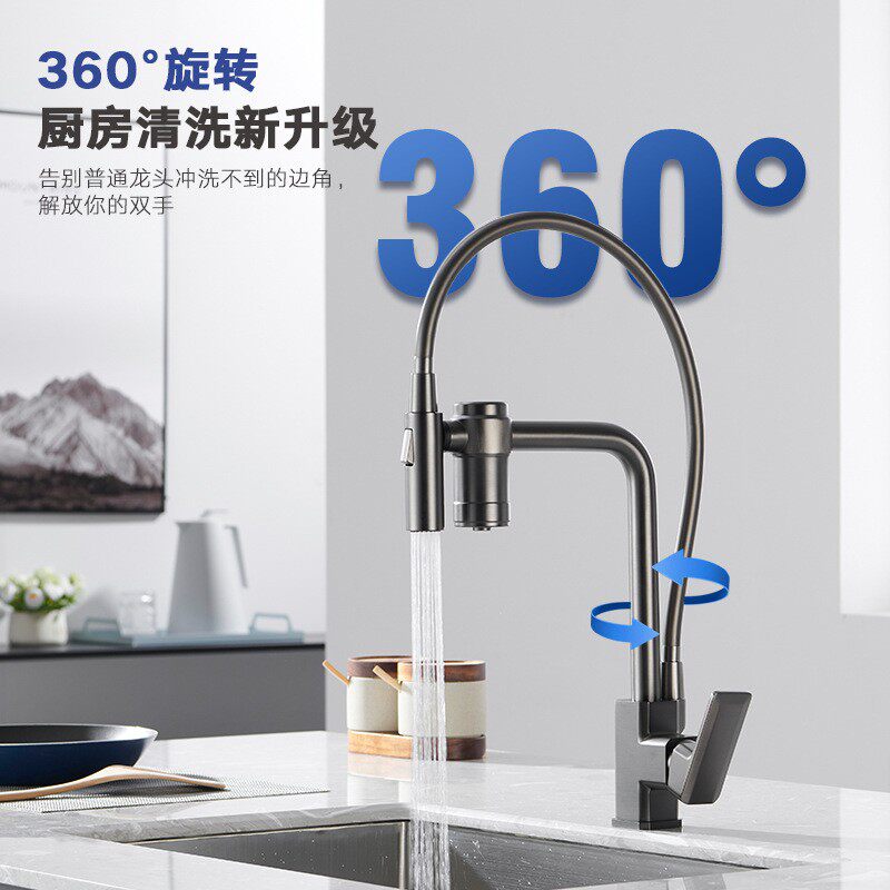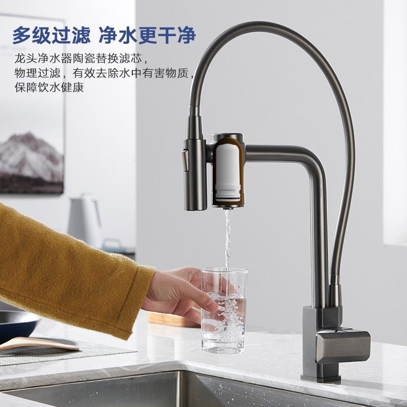 German all-copper gun ash cold and tropical water purification filter rotating magnetic suction return pull kitchen sink faucet