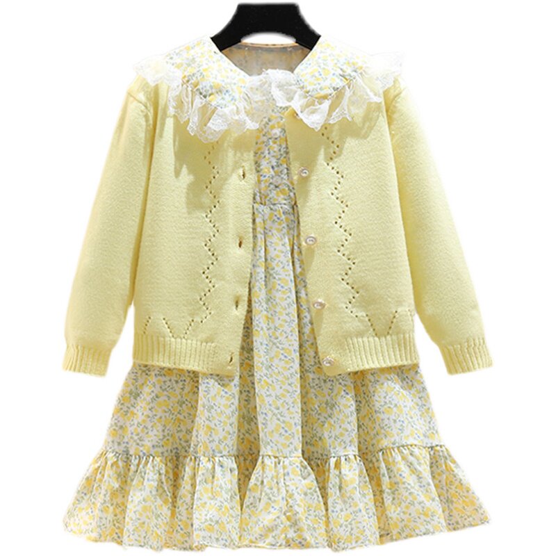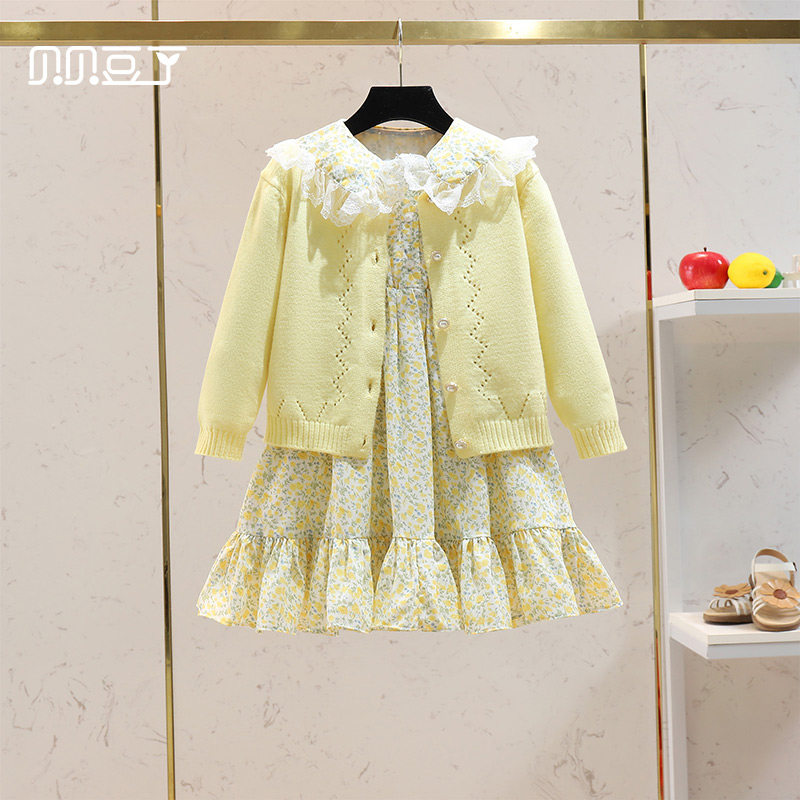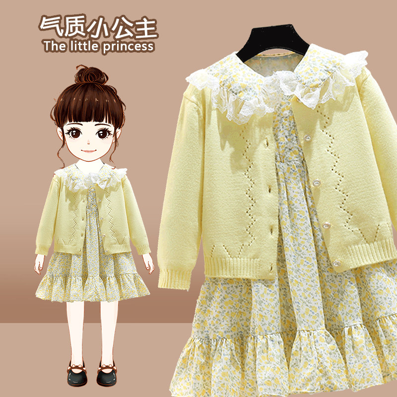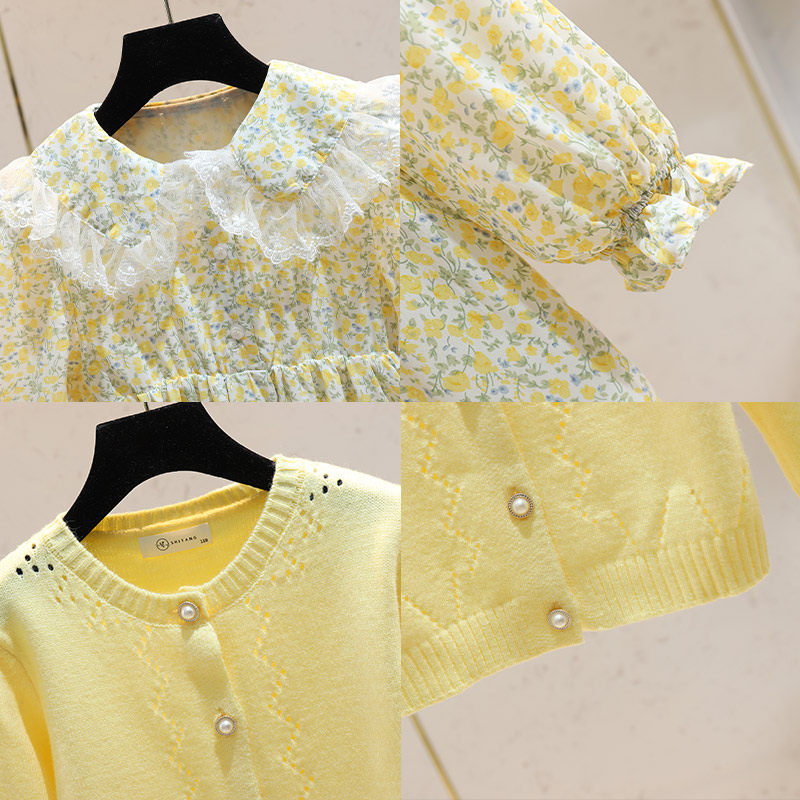 Girl Spring Dress Foreign Dress 2022 New Foreign Korean Ensemble Korean Ensemble High Sense Knit Broken Flowers Skirt Suit Skirt Child Skirt