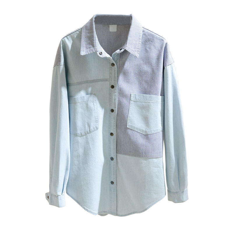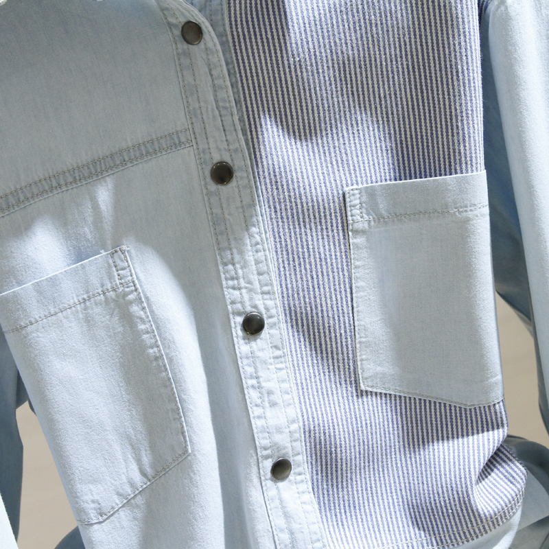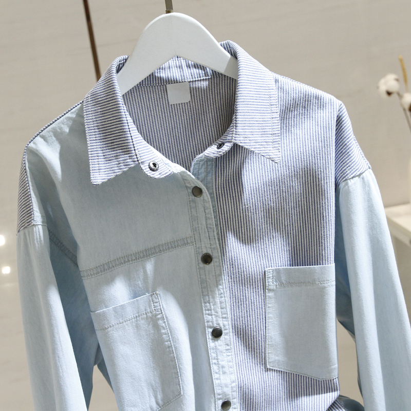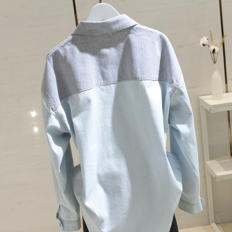 Tide Card Light Blue Striped Splicing Denim Shirt Woman Long Sleeve 2022 Spring New Loose 100 lap over wearing shirt