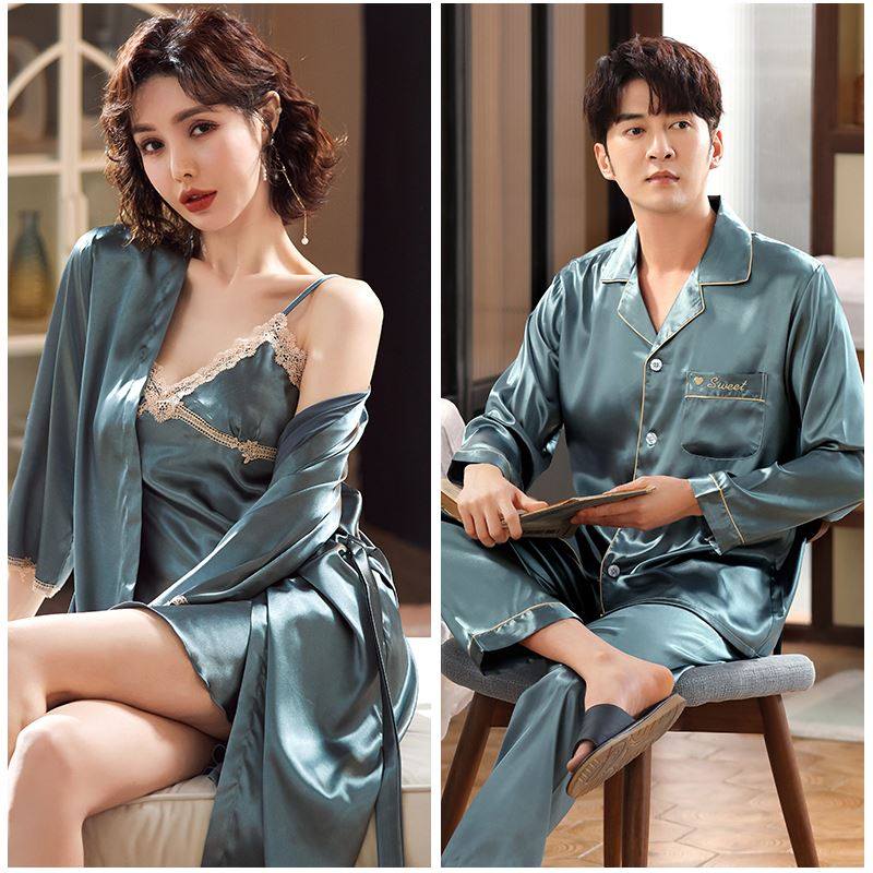 Japanese Spring Autumn Couple Sleepwear Women's Summer Ice Silk Thin Sleeping Dress Pyjamas Male Real Silk Long Sleeve Home Suit