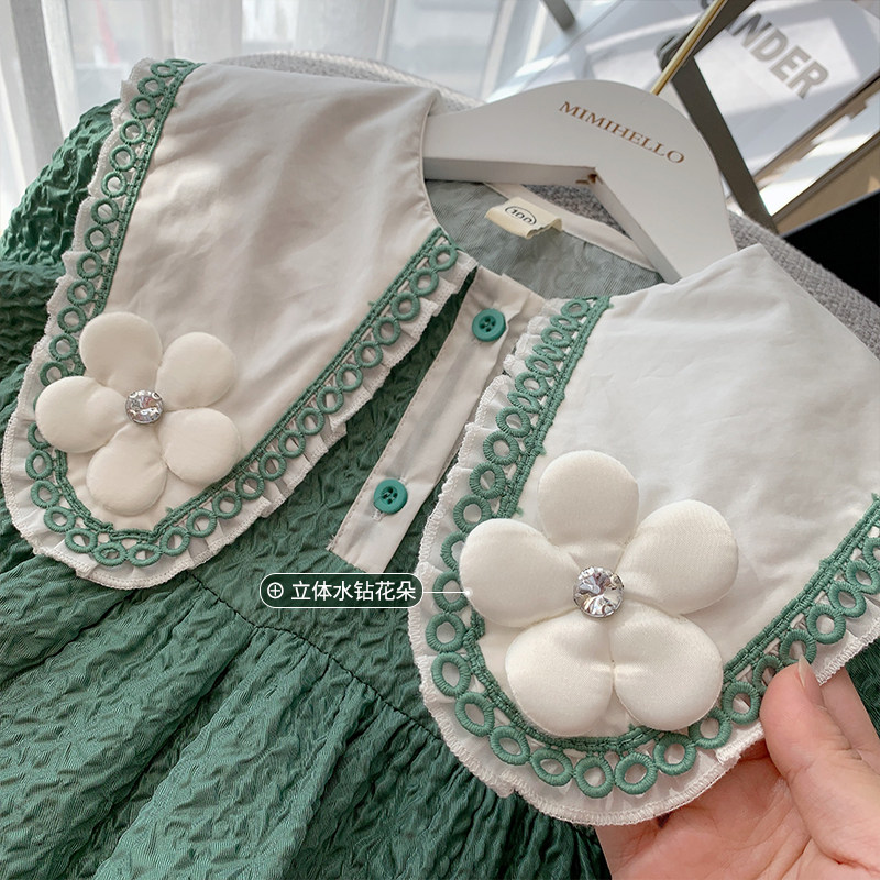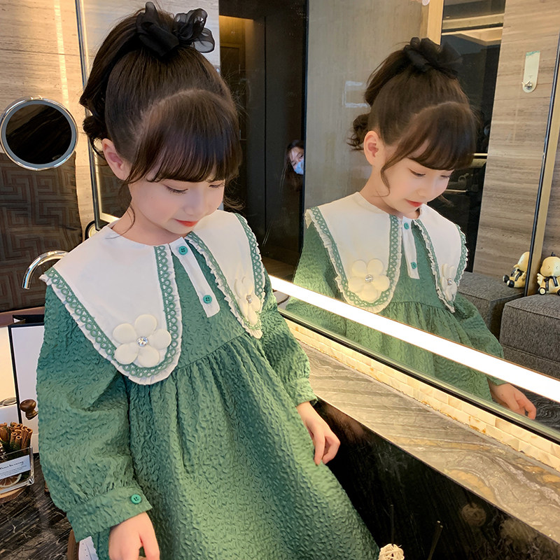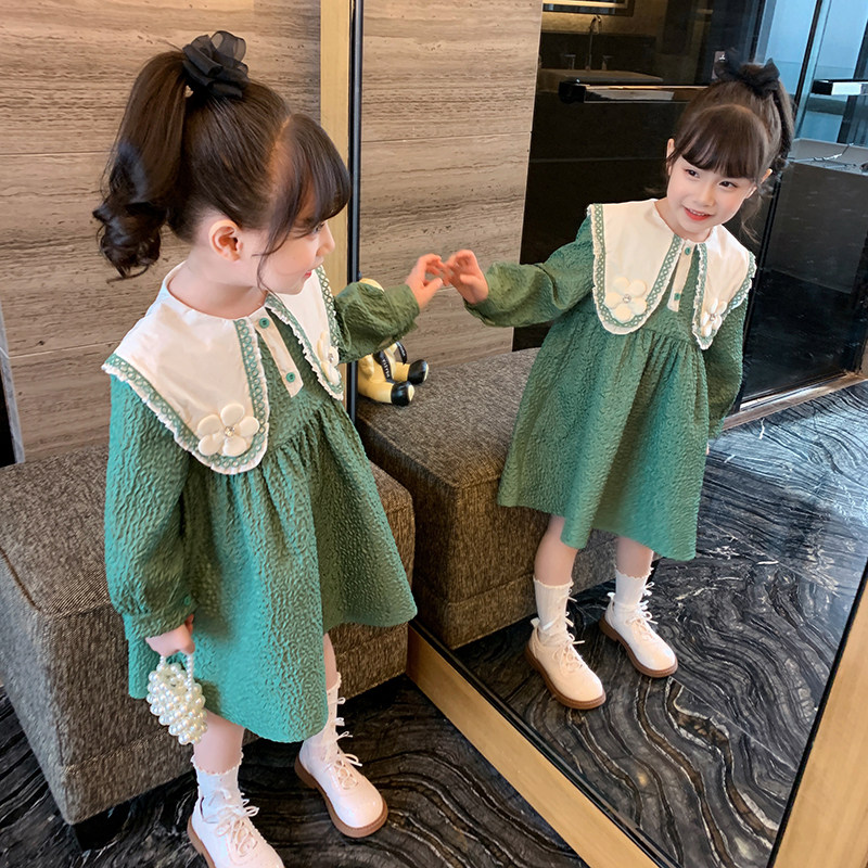Girls dress spring dress 2022 new children's skirt green doll collar foreign princess skirt little girl long sleeves