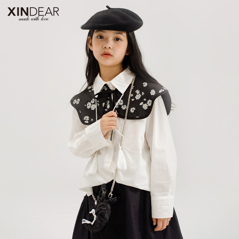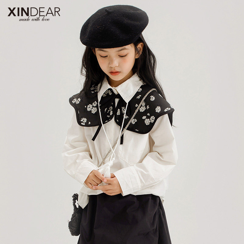 Girl Spring Autumn Country Wind Cape Shirt Pure color white long sleeve blouse Children's day Faculty Wind Turned Collar Shirt