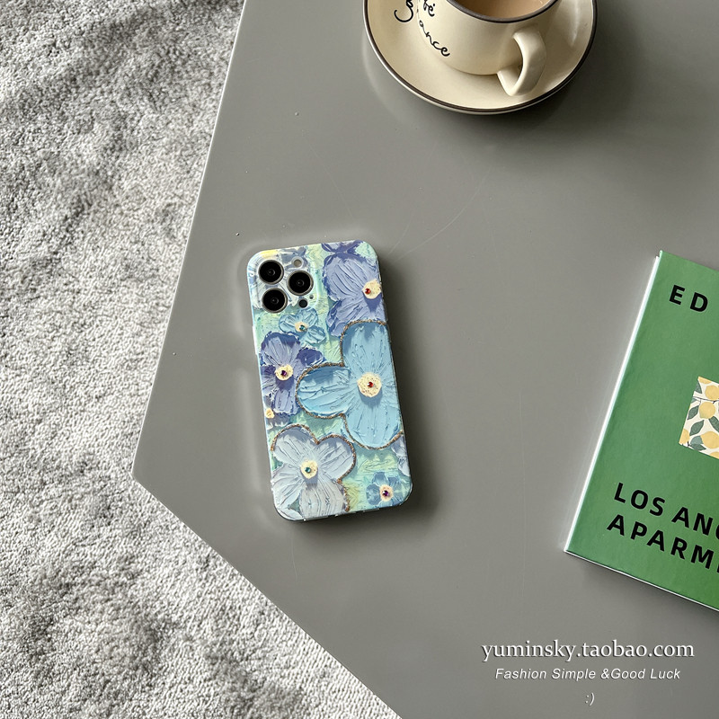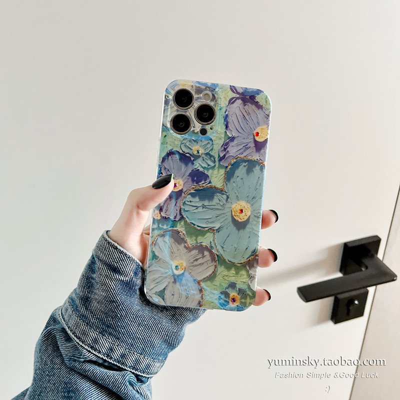 Blue light oil painting flower applicable iPhone12 13promax Apple 11 mobile phone protection shell xs female xr creative 8 water drill