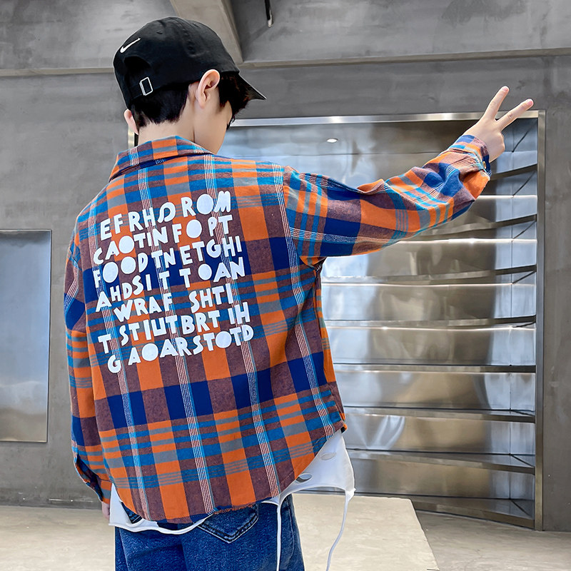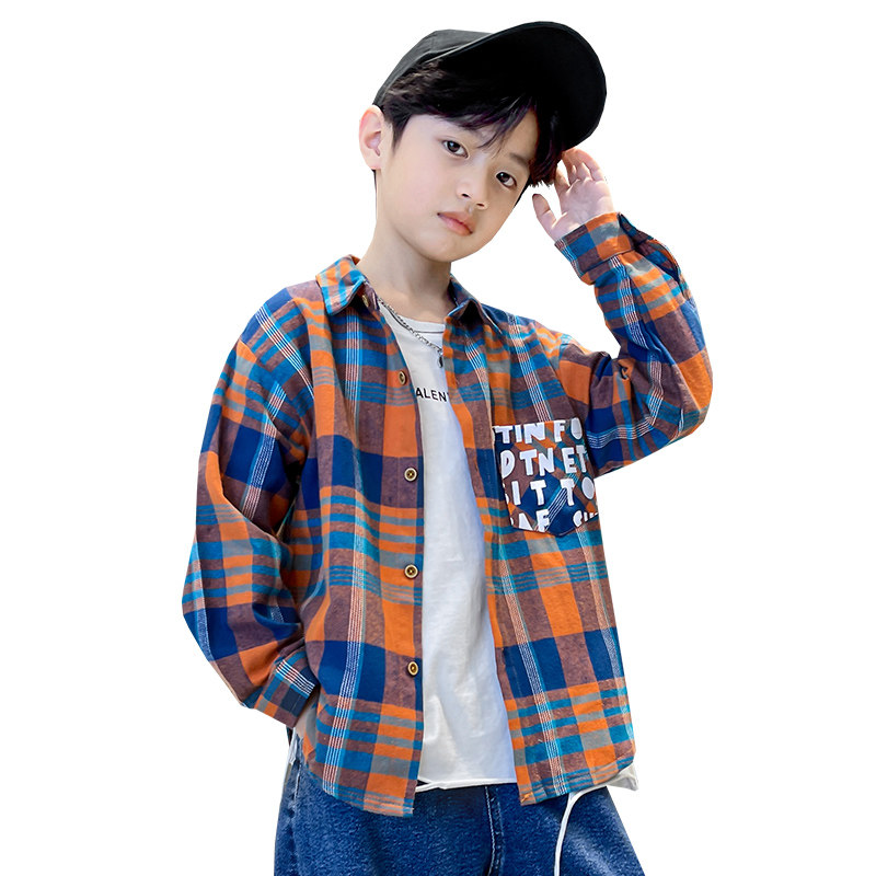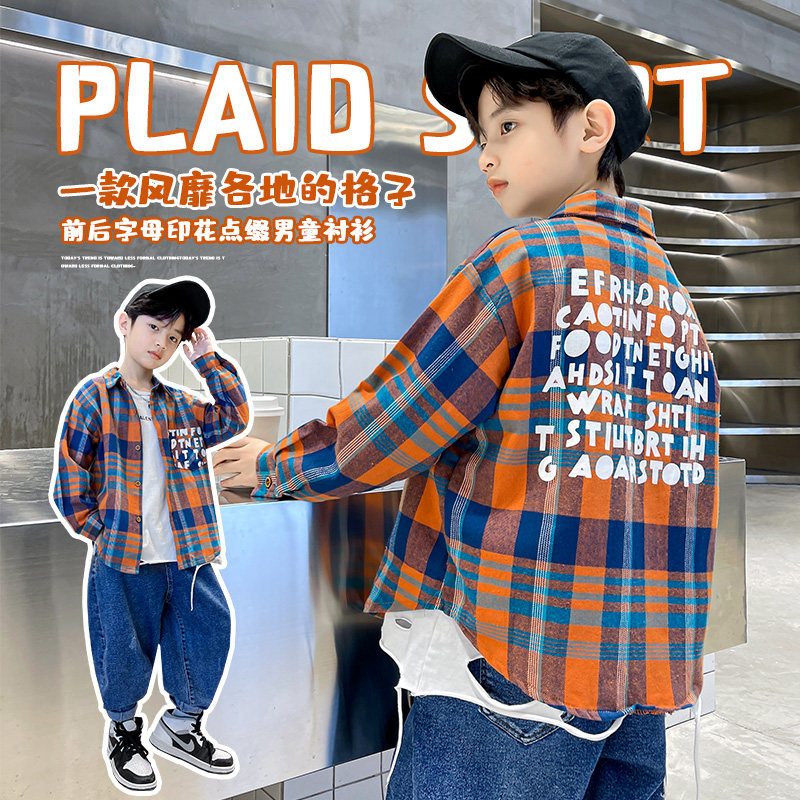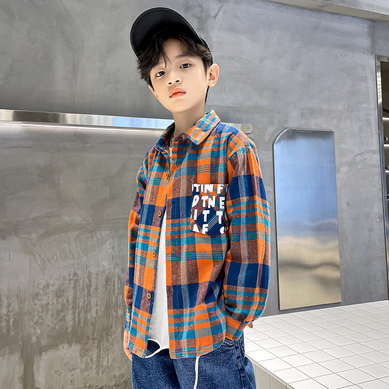 Boy Shirt Spring Autumn 2022 New Fried Street CUHK Children's Dress Plaid Shirt Boy Spring Dress Long Sleeve Blouse Tide