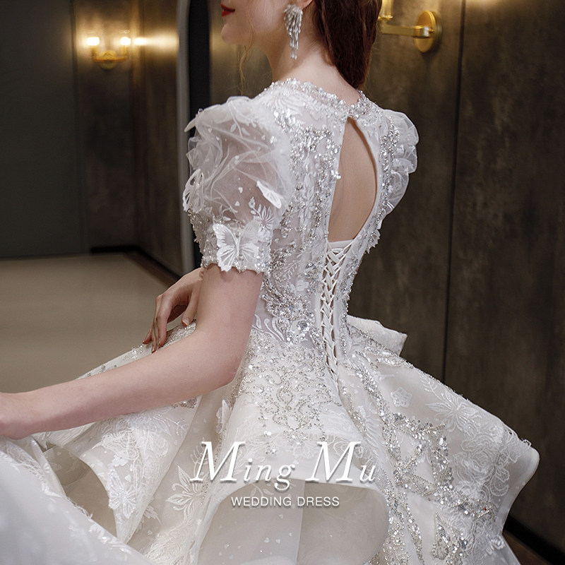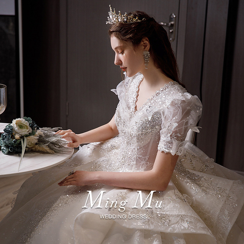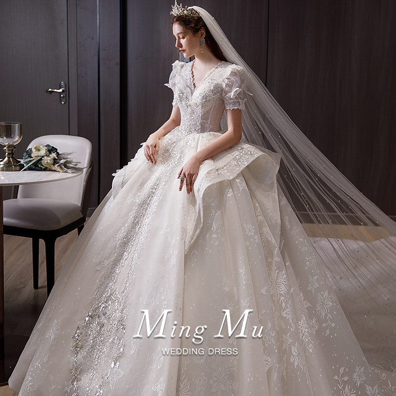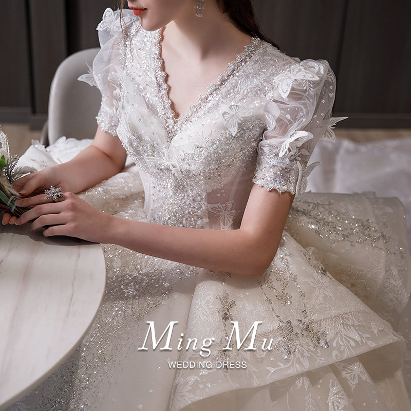 French main wedding dress 2022 new bride female small tail V-neck short-sleeved heavy industry luxury high-end large size