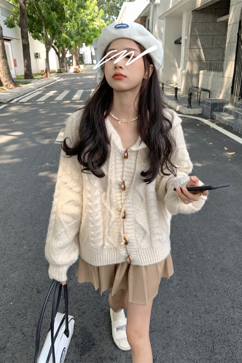 2022 spring new lazy style knitted cardigan college soft waxy milk white twist horn button hooded sweater jacket