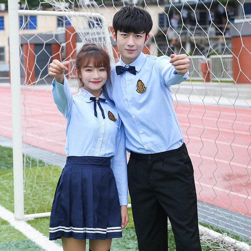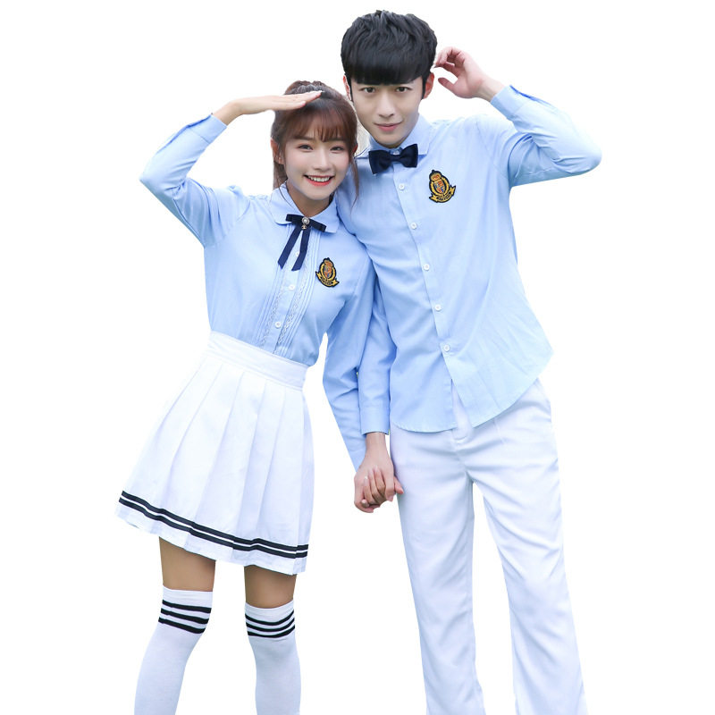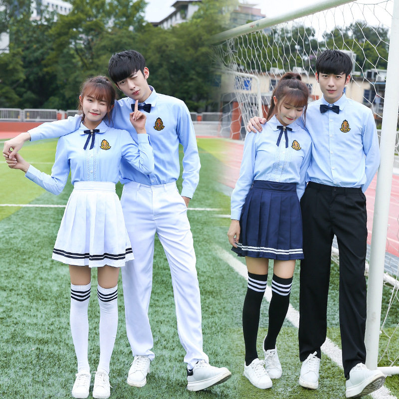 Women's blue long-sleeved black striped skirt men's blue long-sleeved white trousers women's blue long-sleeved blue striped skirt men's blue long-sleeved black trousers women's blue long-sleeved white striped skirt women's blue short-sleeved Blue striped skirt men's blue short-sleeved white shorts