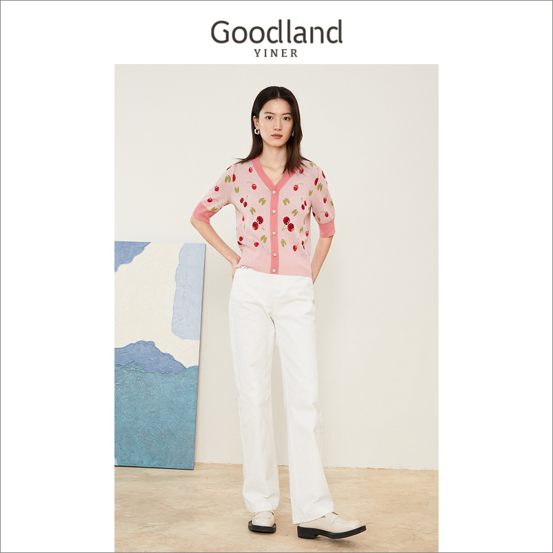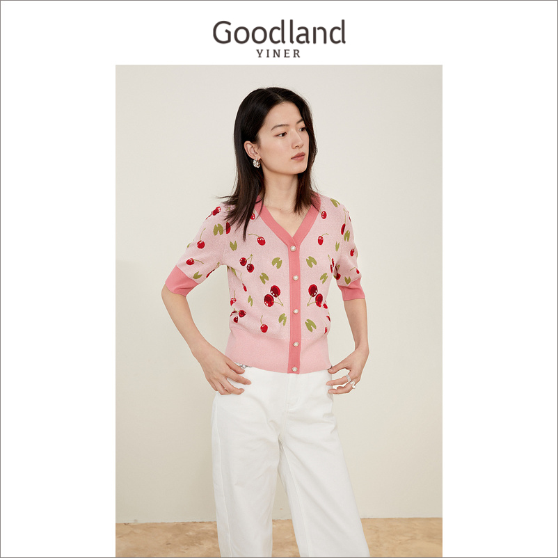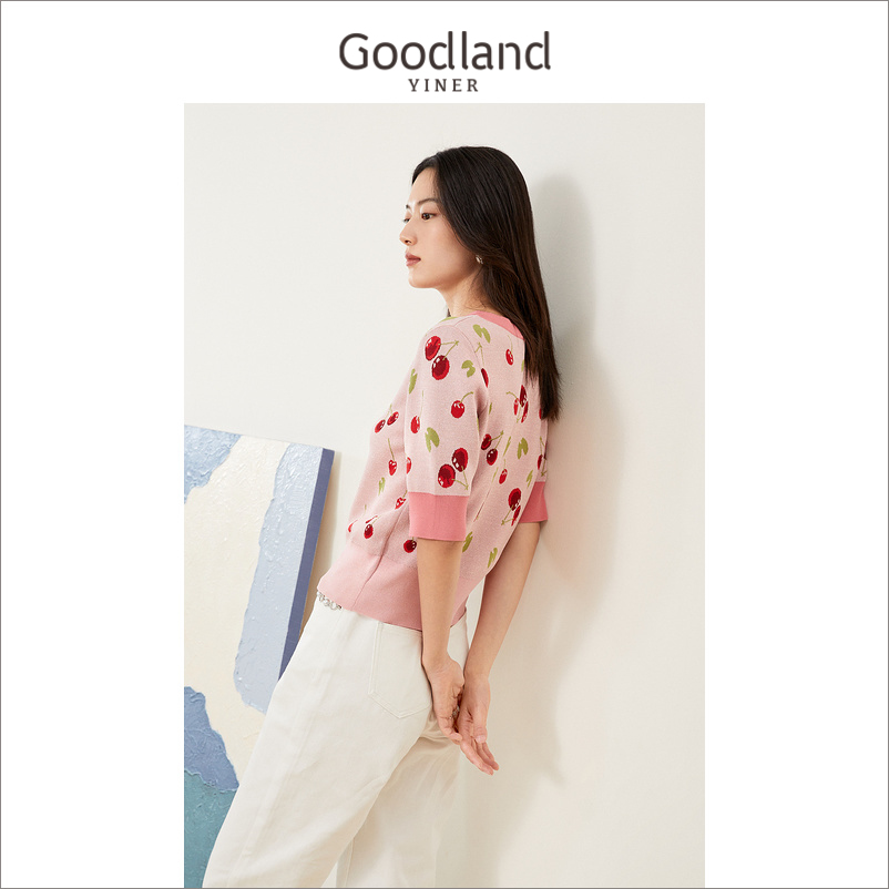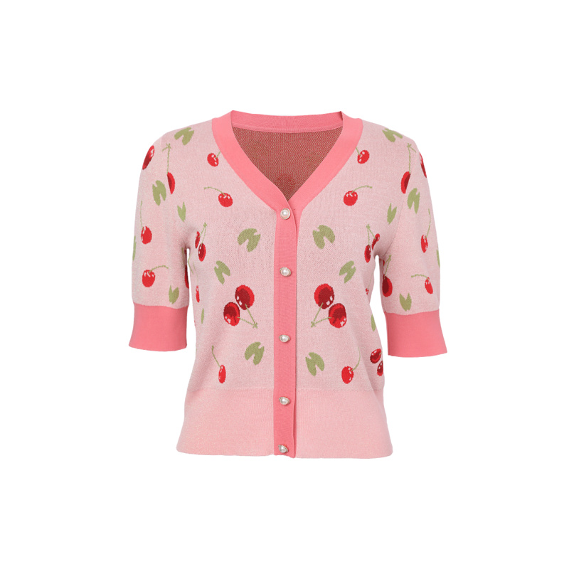 Yinko Mei Women's Clothes 2022 Summer New Bright Silk Cherry Print Coloring Knitted Sweater