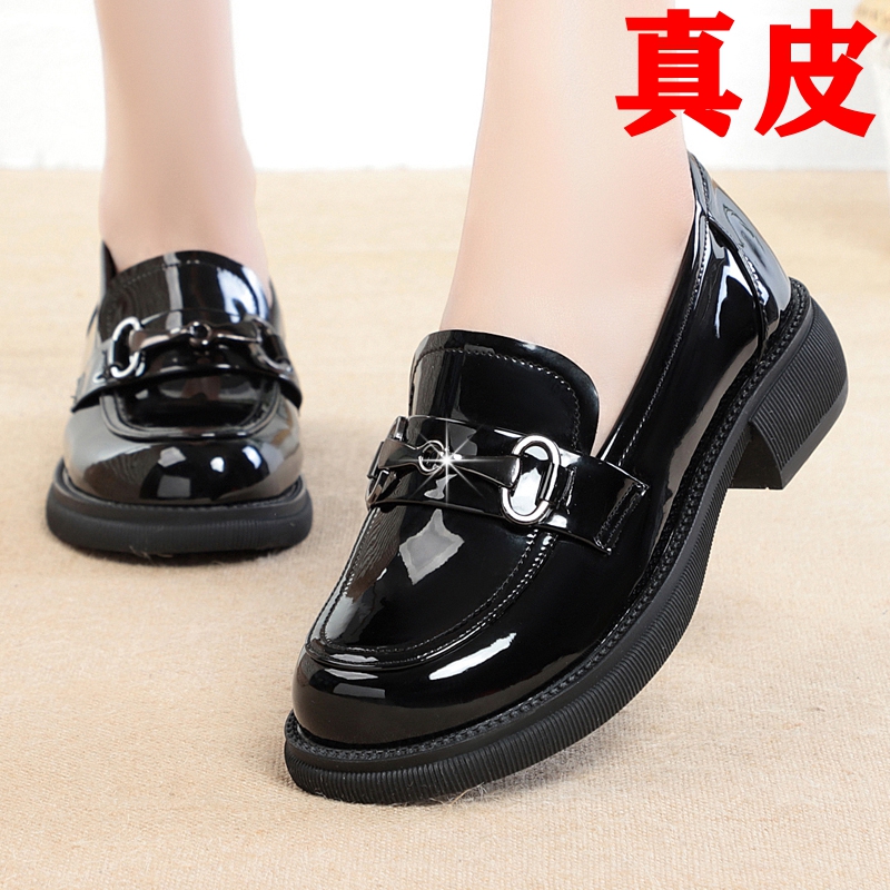 2022 Spring autumn season new genuine leather Skylar lacquer leather black small leather shoes coarse with round head flat-bottomed female single shoes