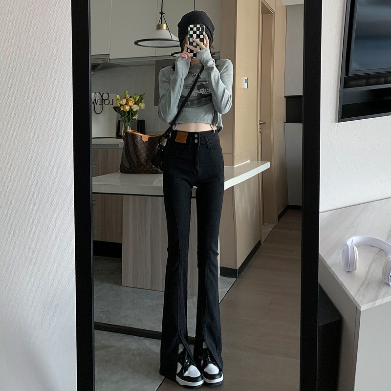 Black High Waist Microlao Jeans Woman 2022 Spring Summer Display Slim Open Fork Horn Pants Pituality Drag Long Pants