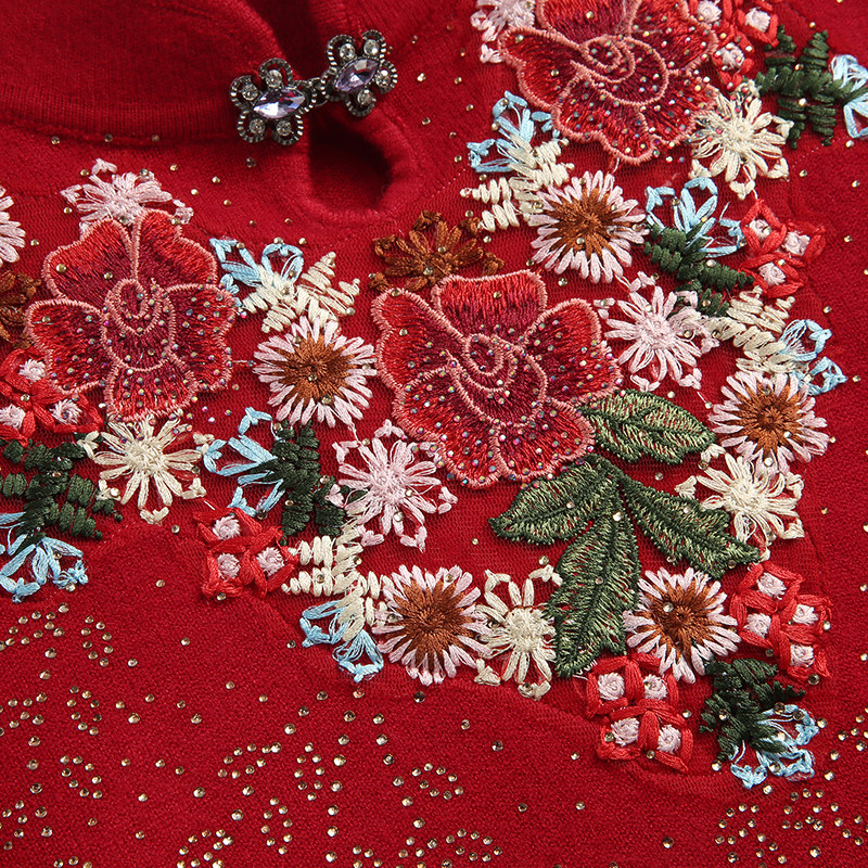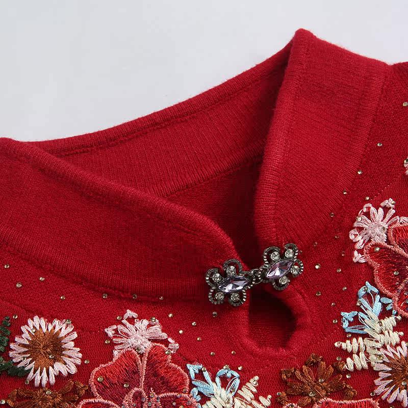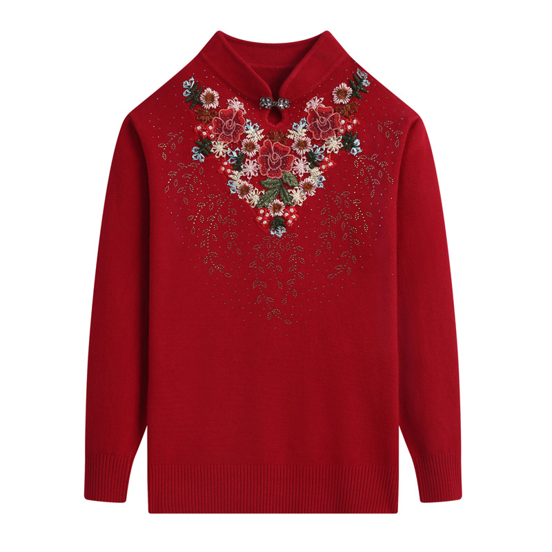 Mother Loaded Loose Needle Weaselwear Embroidered Thin Sweatshirt Spring Autumn Qipao Qipao Collar Blouses Mid-Age Women's Dress Foreign Sheep Sweatshirt
