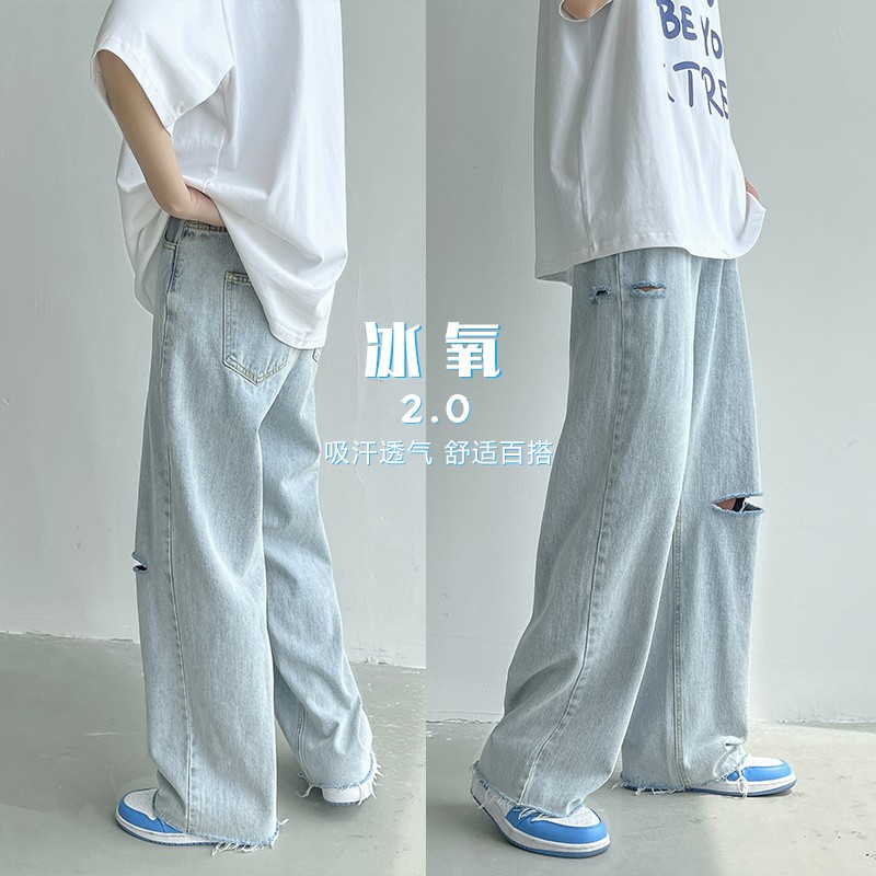 Light-coloured broken hole wool side jeans Men's loose straight drum Summer slim Tide Cards Broadlegged Pants Casual 100 lap long pants