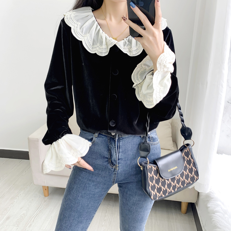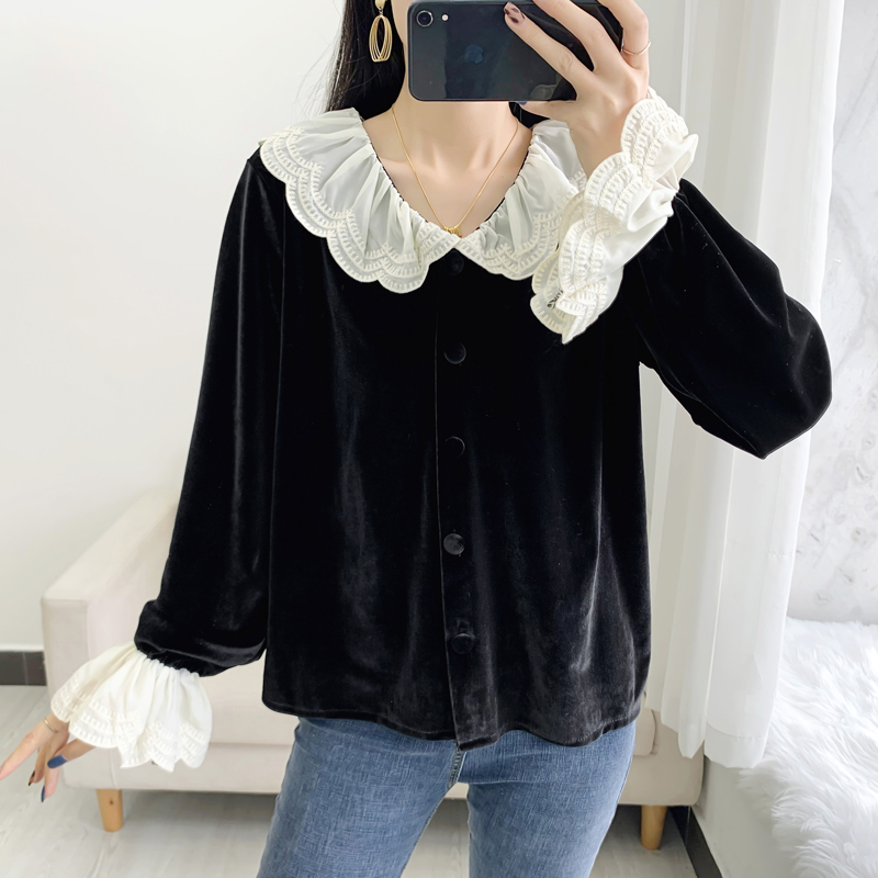 Fall girl shirt long sleeve doll collar bottom shirt loose sweet gold velvet female hit color blouse weight loss and weight loss