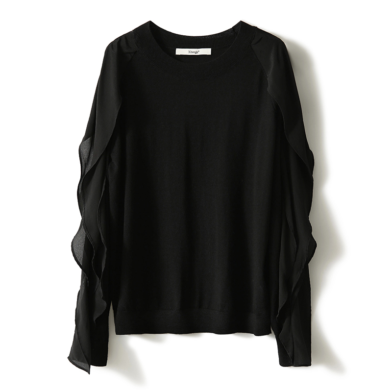 The Smiling Culvert early spring trendy black fine wool mulberry silk round neck-knitted sweatshirt blouses ZYG360883AG