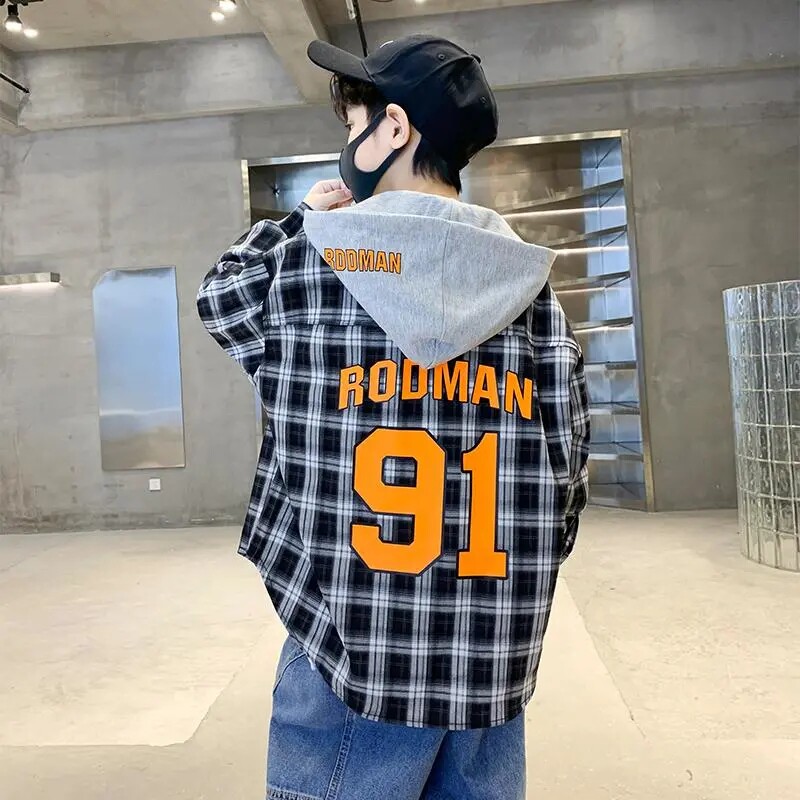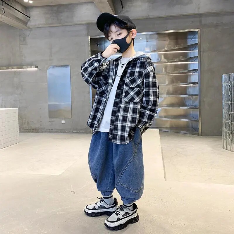 Boy Plaid Shirt Spring Autumn Season 2022 New Children Loose Long Sleeve Shirt CUHK Boy Handsome gas Lianhood jacket