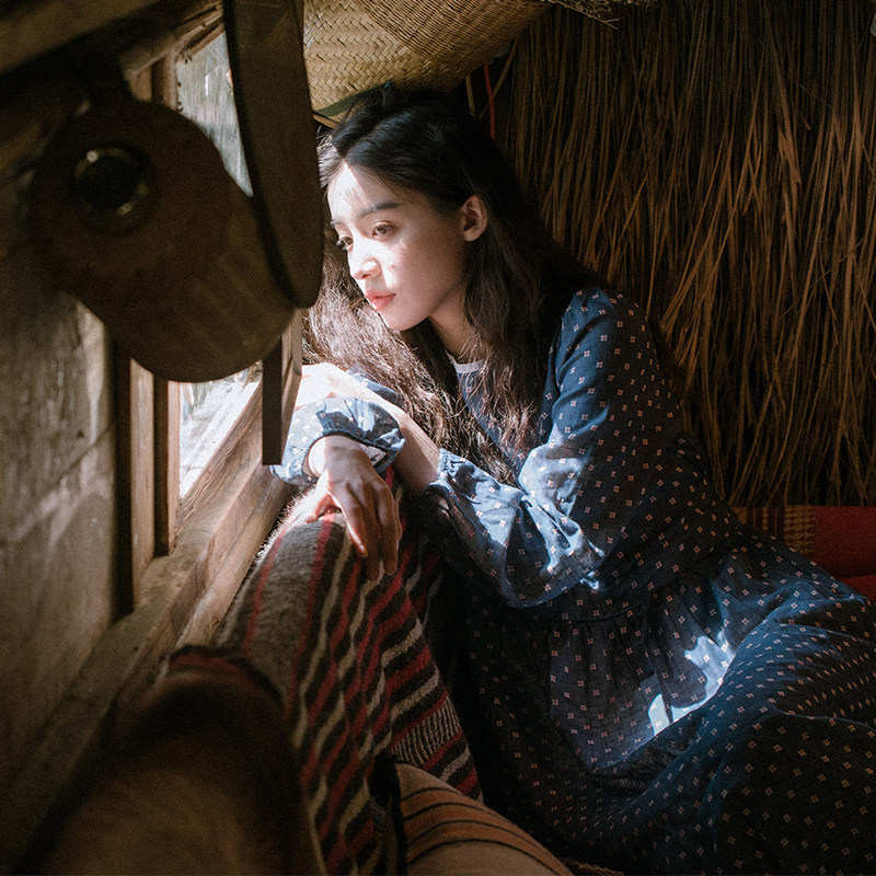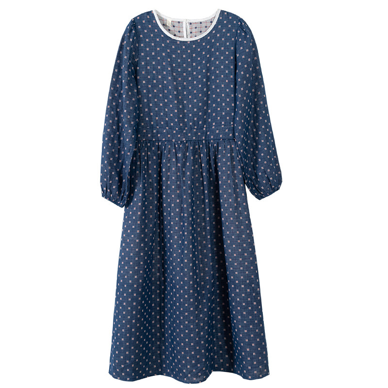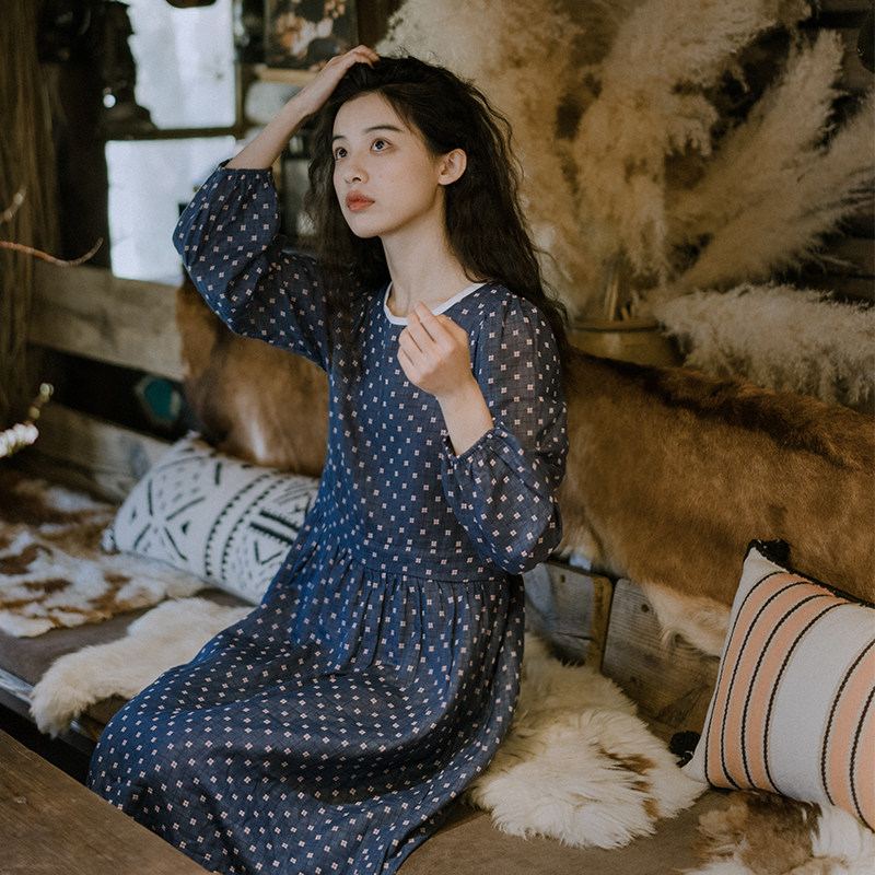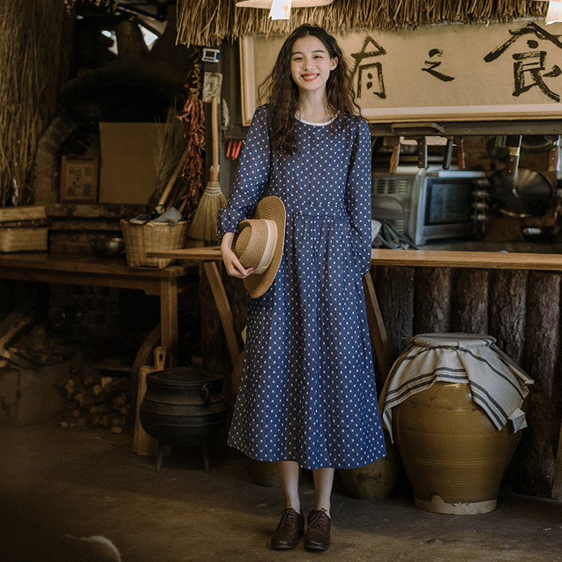 Dream horse Japanese retro long-sleeved dress cotton and linen round neck skirt waist literary niche long skirt spring and summer
