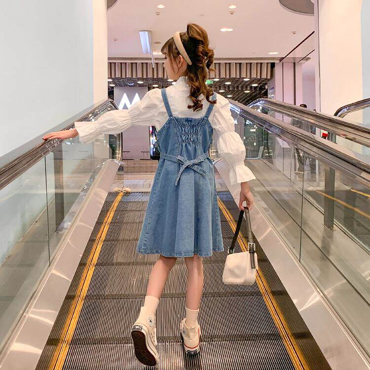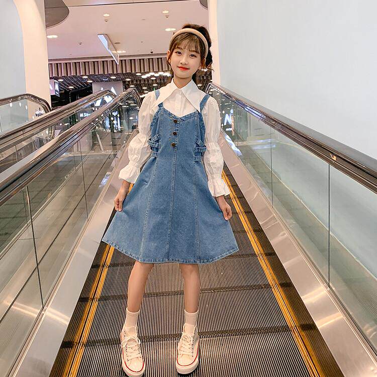Girls spring dresses 2022 new middle and big children spring baby bag skirt children's denim shirt net red suspender skirt