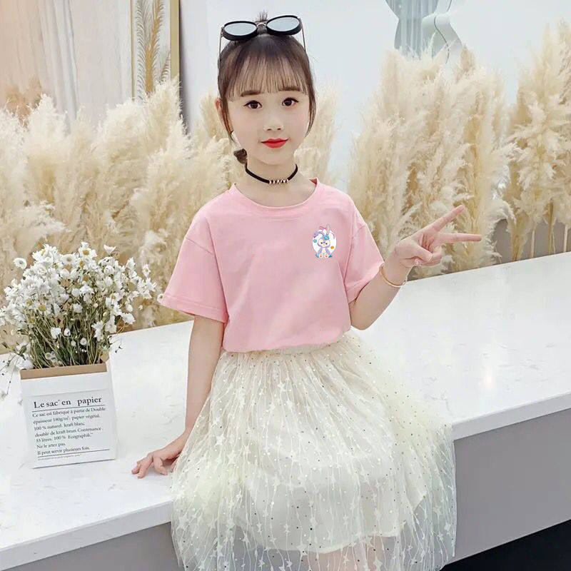 Xingdelu girls' short-sleeved t-shirt new fashion print princess style big children's summer clothes with cotton children's tops
