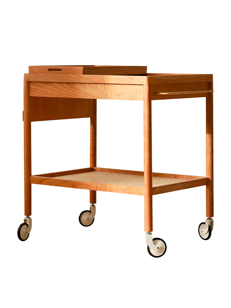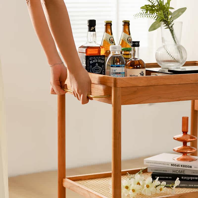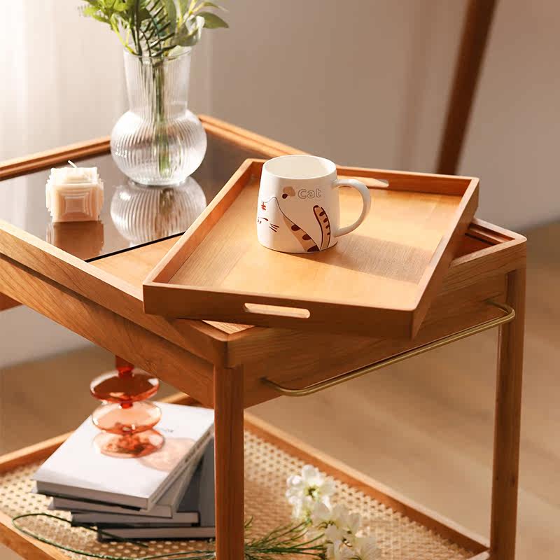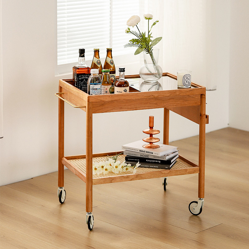 Nordic solid wood sofa side table living room cherry wood glass coffee table Japanese-style movable trolley with wheel locker