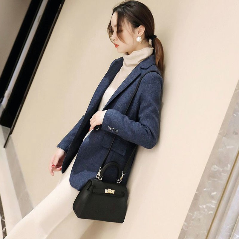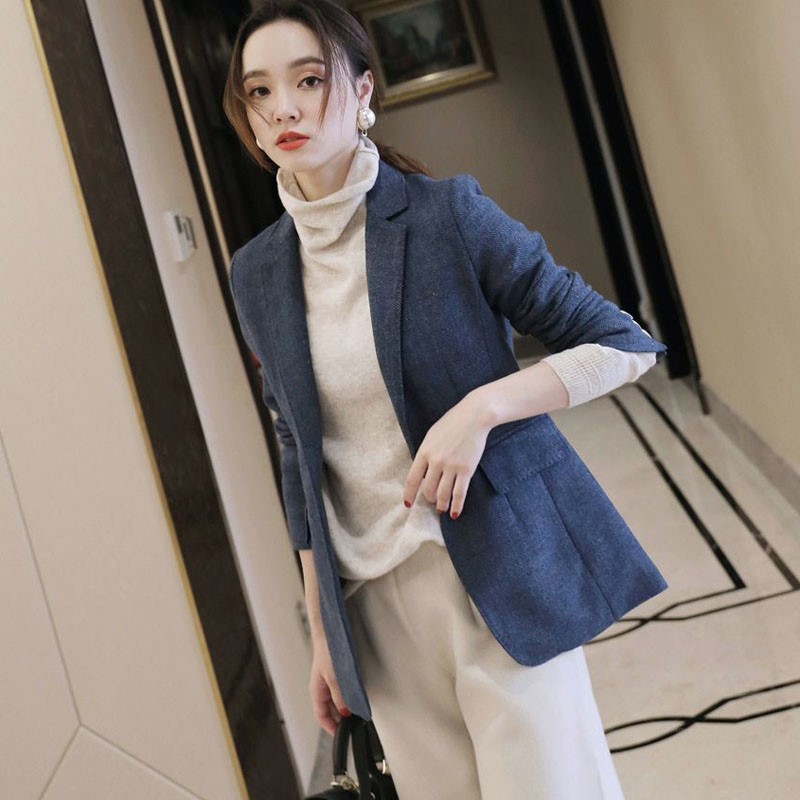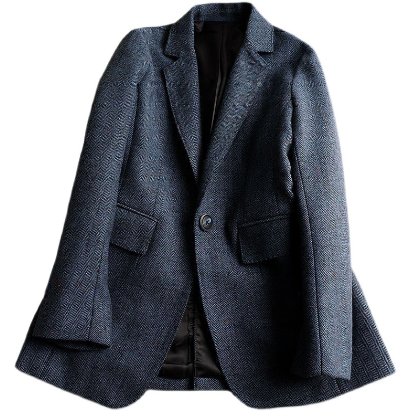 Woolen suit jacket female blue small 2022 new spring and autumn casual herringbone pattern professional suit top
