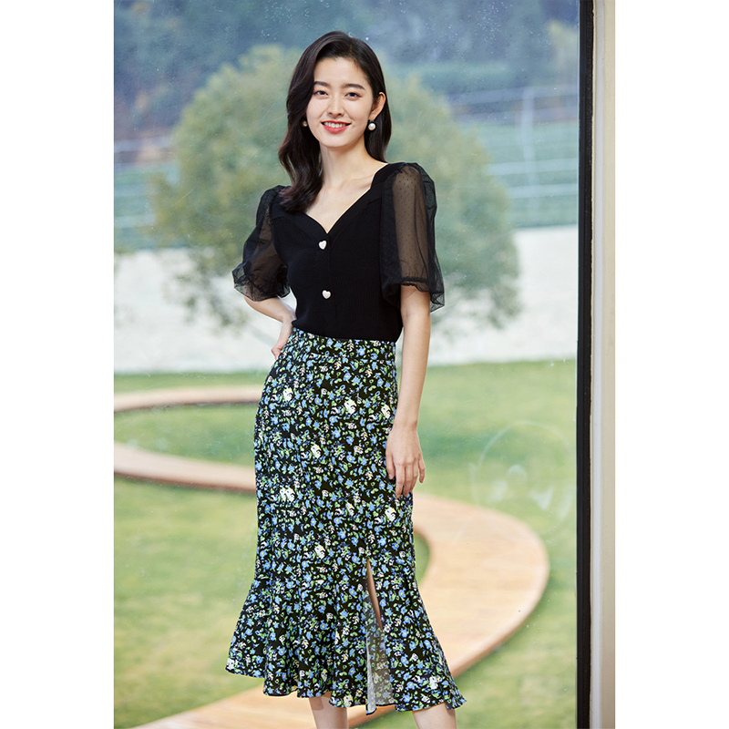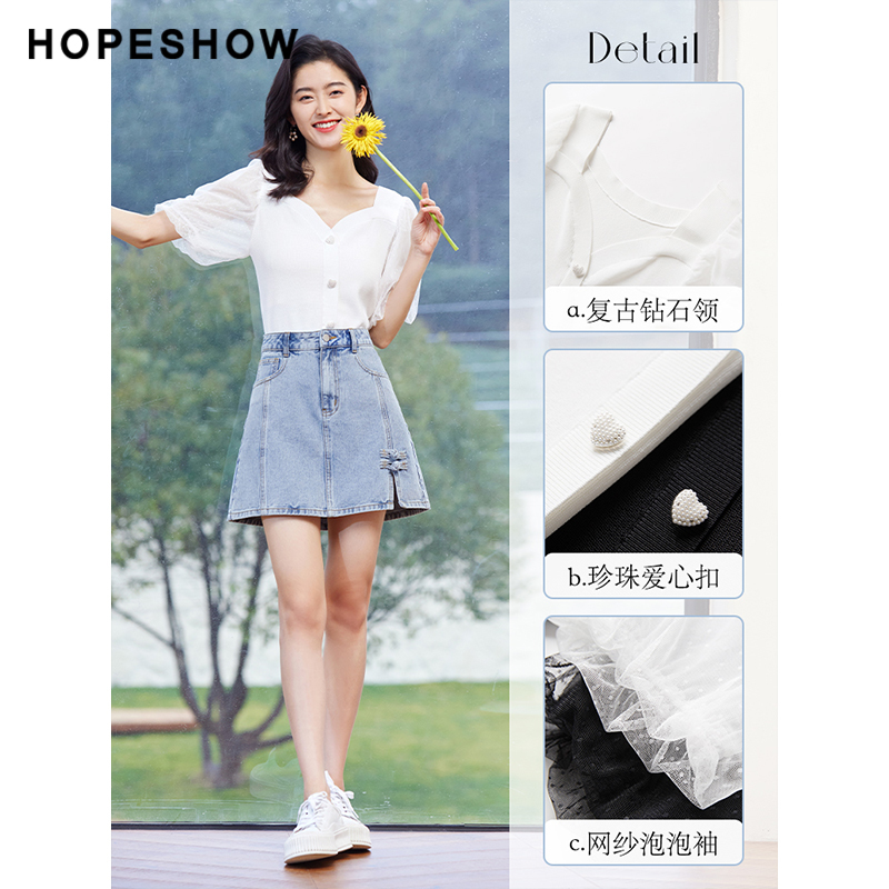 Red Sleeve Bubble Cuff knitted Shirt Summer 2022 new women's clothing web yarn splicing square collar sweet and white short sleeve blouse