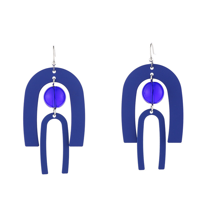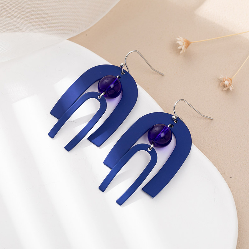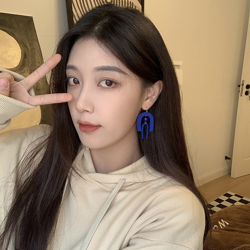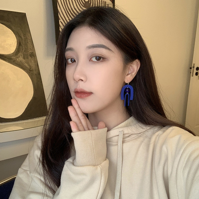 Hepburn style earrings Hong Kong style exaggerated geometric blue matte texture ear hook temperament mosquito coil plate without ear hole ear clip female