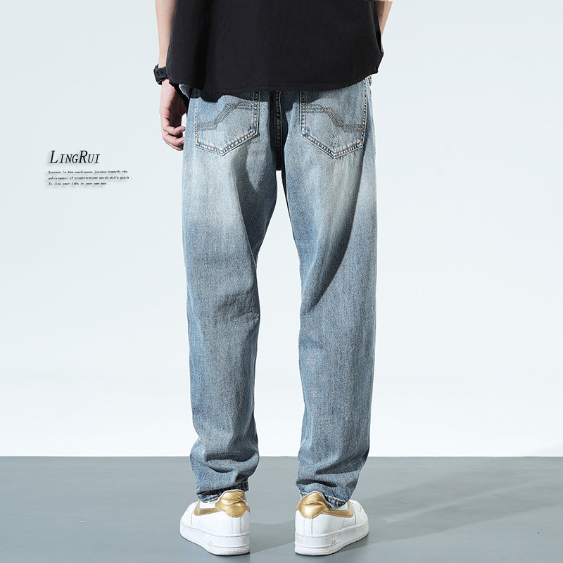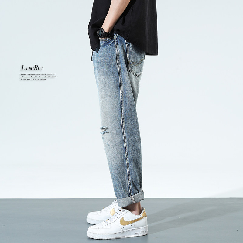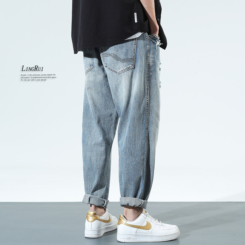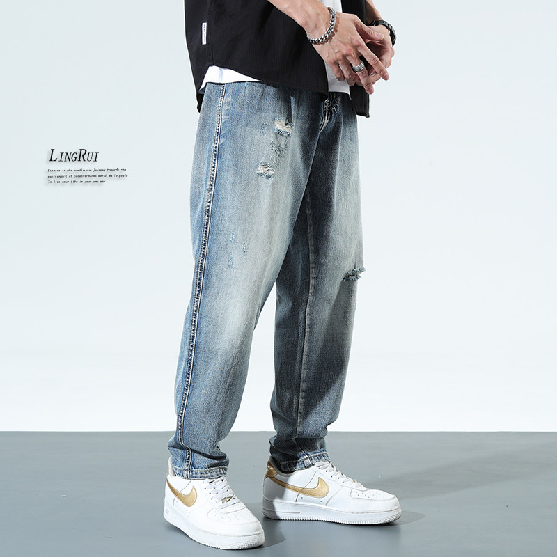 Summer Break Hole jeans Men's loose large size Harlan pants trendy casual American retro washed straight tube long pants