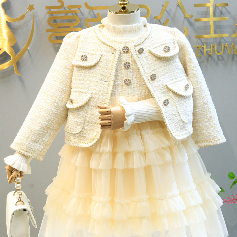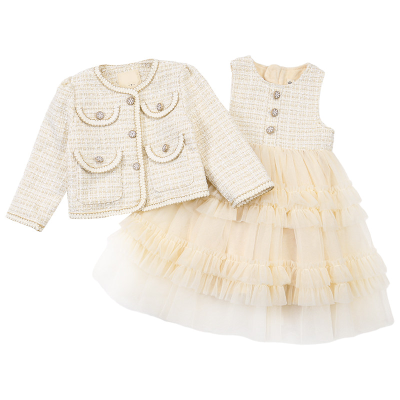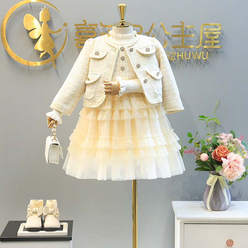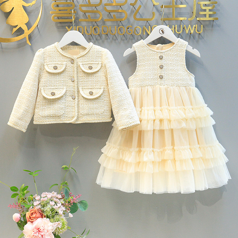Hong Kong Girl Suit Small Scent Wind 2022 Spring Autumn Clothing New Style Jacket Children's Vest Dress Plus Suede Two Sets