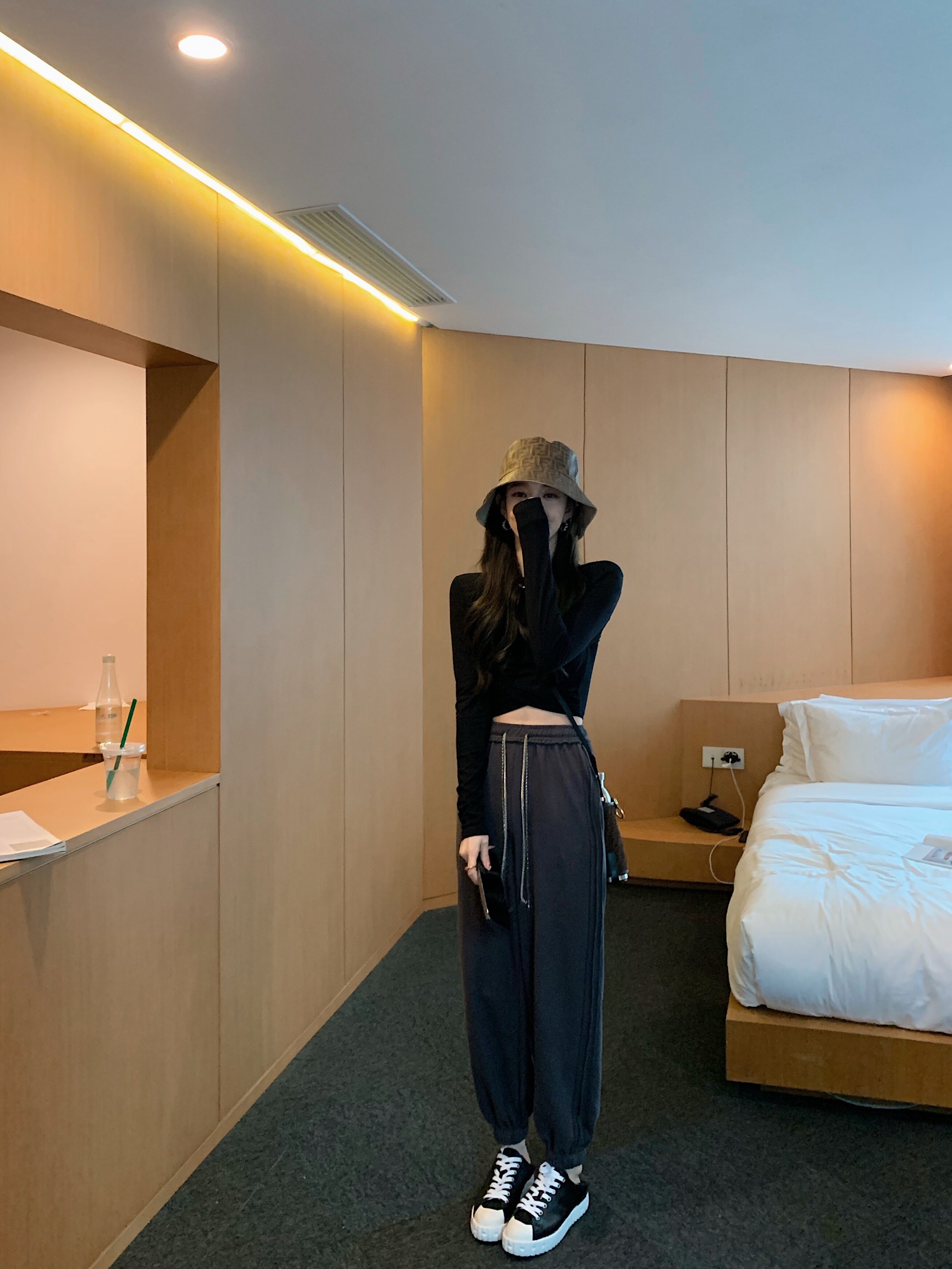 The female pants are high in the waist.: