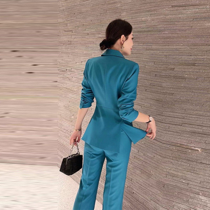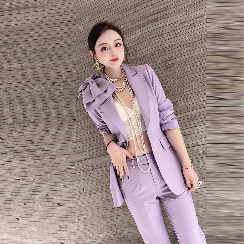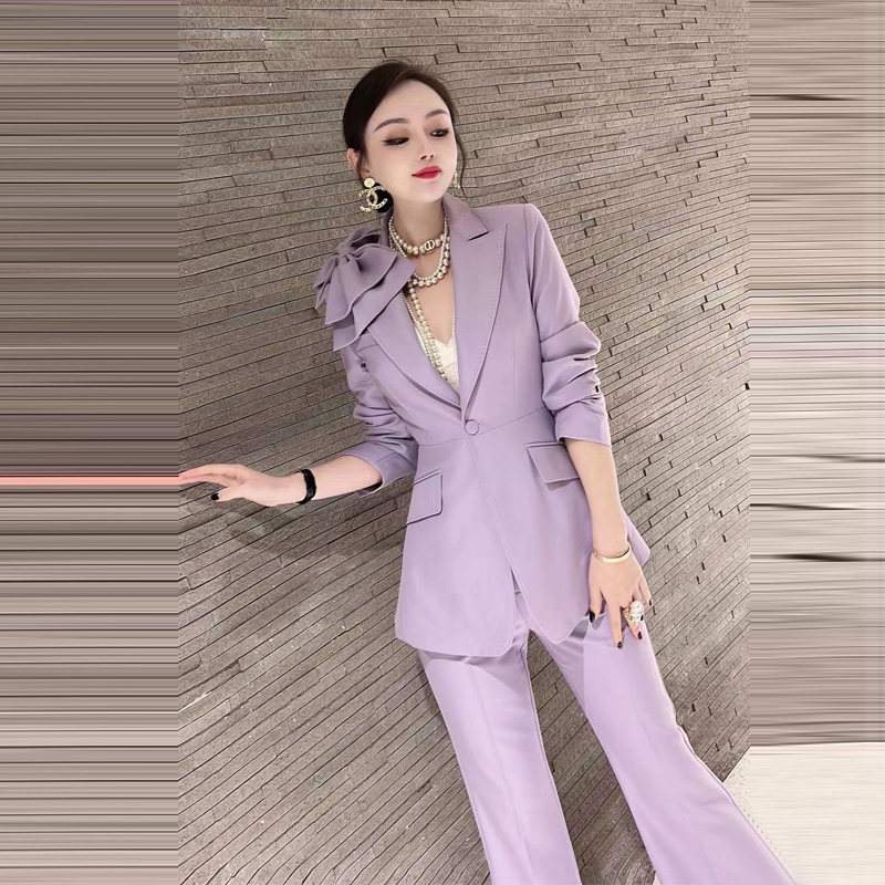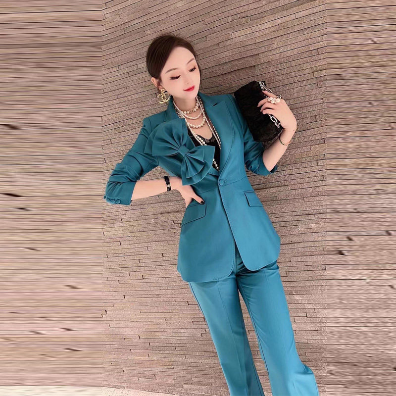 High-quality salt-style fried street suit female bow corsage suit jacket micro-flare pants two-piece fashion temperament