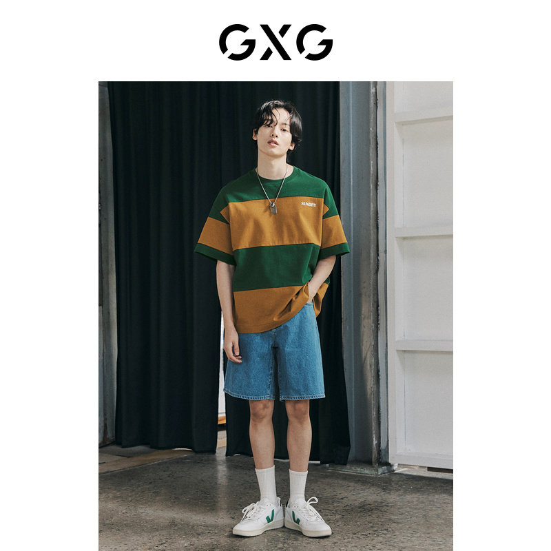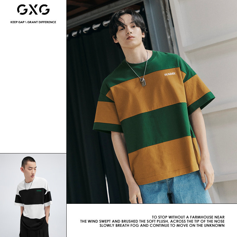 GXG men's heavy wide version striped stitching college style round neck short-sleeved T-shirt 2022 summer new product