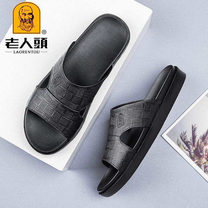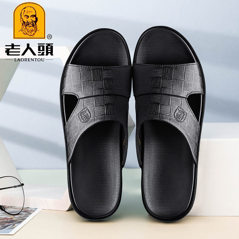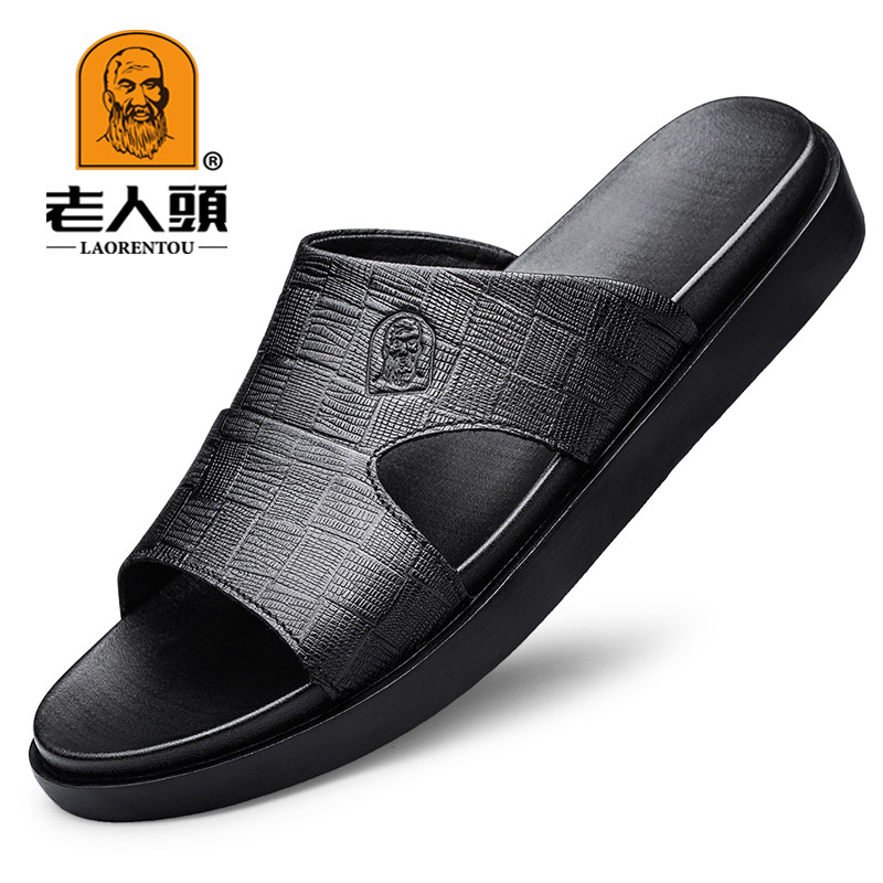 Old man's head sandals men's summer breathable men's leather slippers full cow leather soft bottom outside wearing anti-slip line slippers